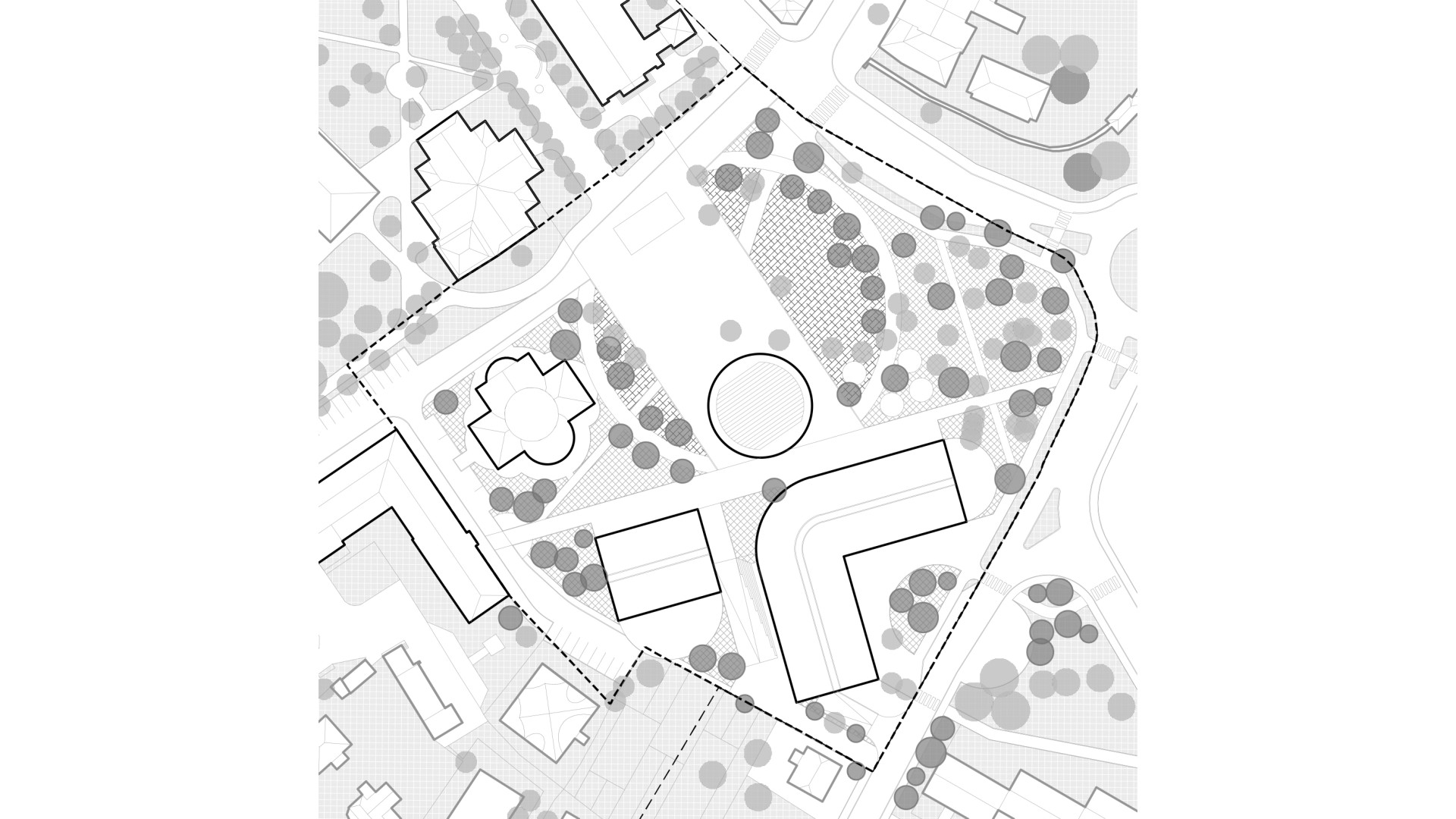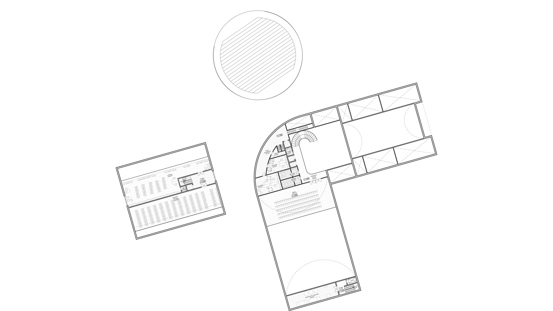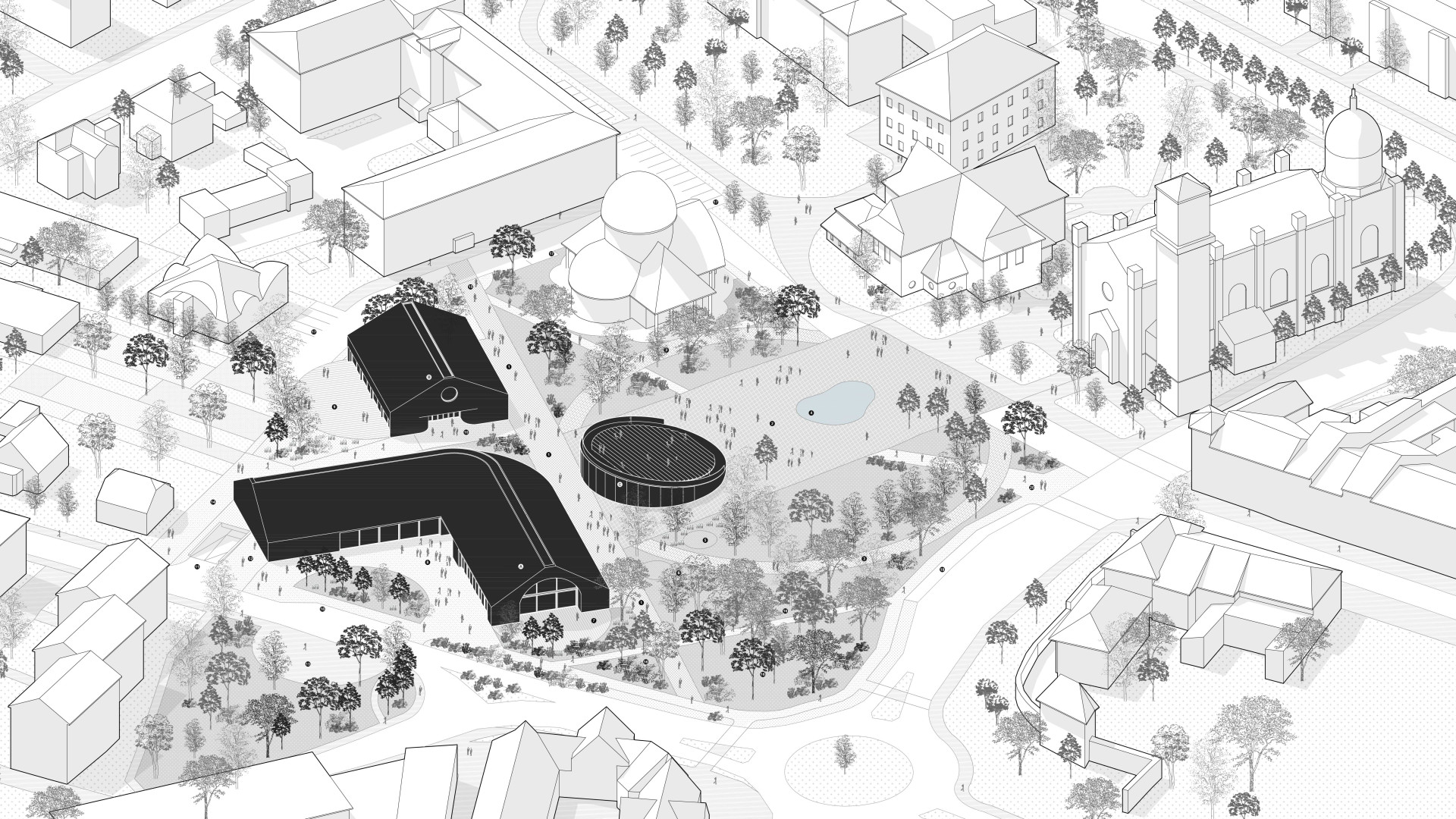 KežmarokThe design is based on the strong visual and cultural identity created by the context of the three churches. This relationship becomes the main conceptual layer of the proposal, seeking balance and hierarchy in order to cultivate the urban environment for different groups of users. Three new standalone buildings complete the composition of the site: a cultural building, a community building, and a commercial pavilion. Their spatial arrangement refers to the motif of the sacred Greek cross, whose rotation generates important intermediate spaces and new pedestrian connections beyond the site itself. Each building is expressed through a distinct architectural character. The cultural building is L-shaped with ceramic cladding, the community building is defined by a rectangular concrete volume, and the circular bistro pavilion is designed with a fully glazed façade and an accessible roof. The architectural language works with circular openings, arches, and pitched roof forms. The cultural building is organized into two wings — one containing the main hall, the other accommodating the foyer, small hall, and retail units. Between them, a service core with public facilities connects directly to the public space. The library is designed as a three-bay layout with centrally positioned service spaces. Both main buildings include underground parking, while the ground floor remains visually open and permeable. The public realm is structured through three key spatial elements: the promenade, the circle, and the square. The promenade connects active ground floors and main entrances, while forming a diagonal urban link toward the planned town hall. The square becomes the central civic space, oriented toward the Articular and Evangelical churches and connected to the historic pedestrian axis lined with trees. Green areas, fountains, terraces, and a wooden playscape create an active public environment adaptable for markets, festivals, and concerts throughout the year. The accessible roof of the circular pavilion extends public activity vertically, functioning as an amphitheatre, viewpoint, and informal gathering space. The proposal aims to create a contemporary urban environment that builds on the historical identity of the place.