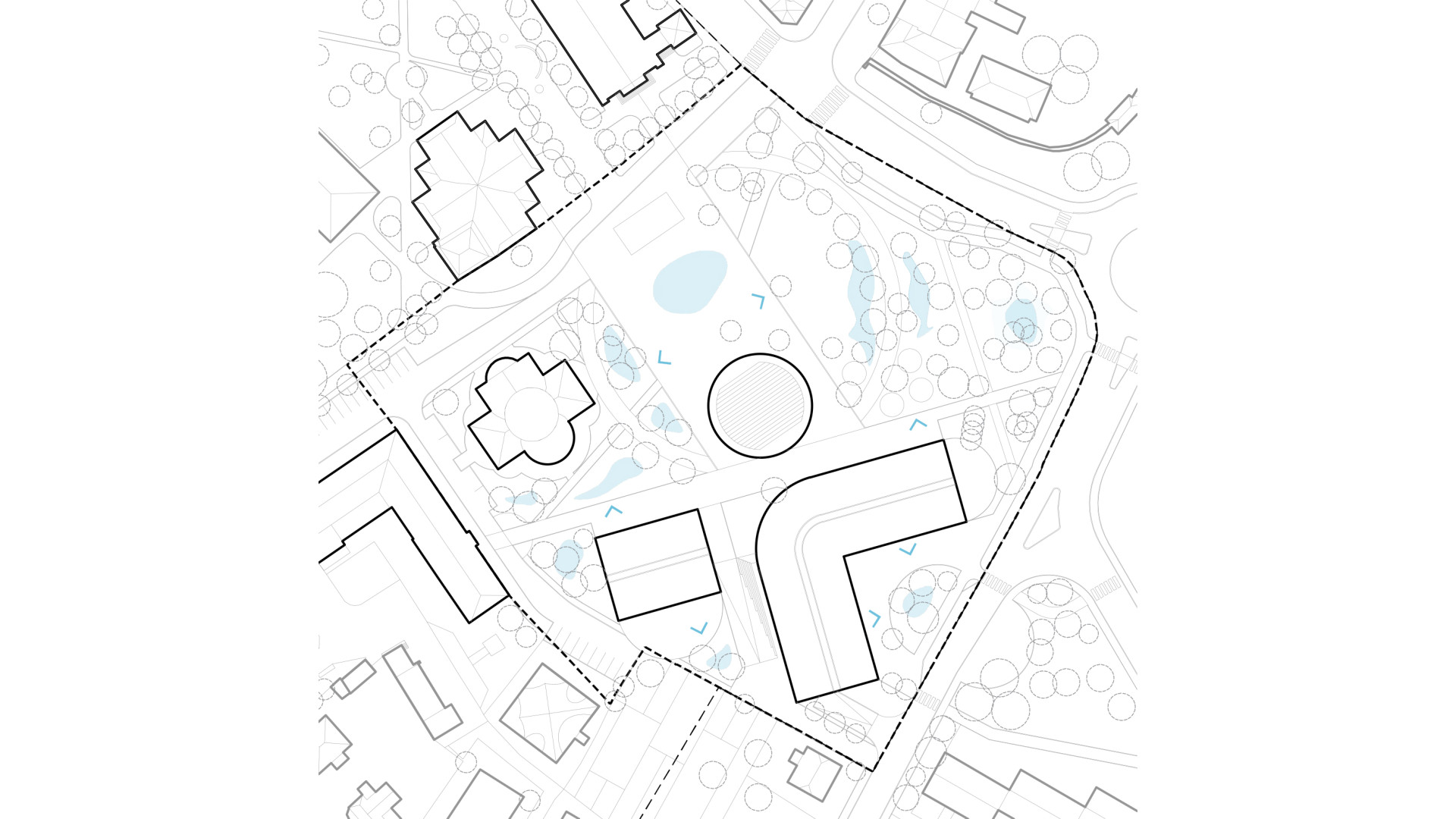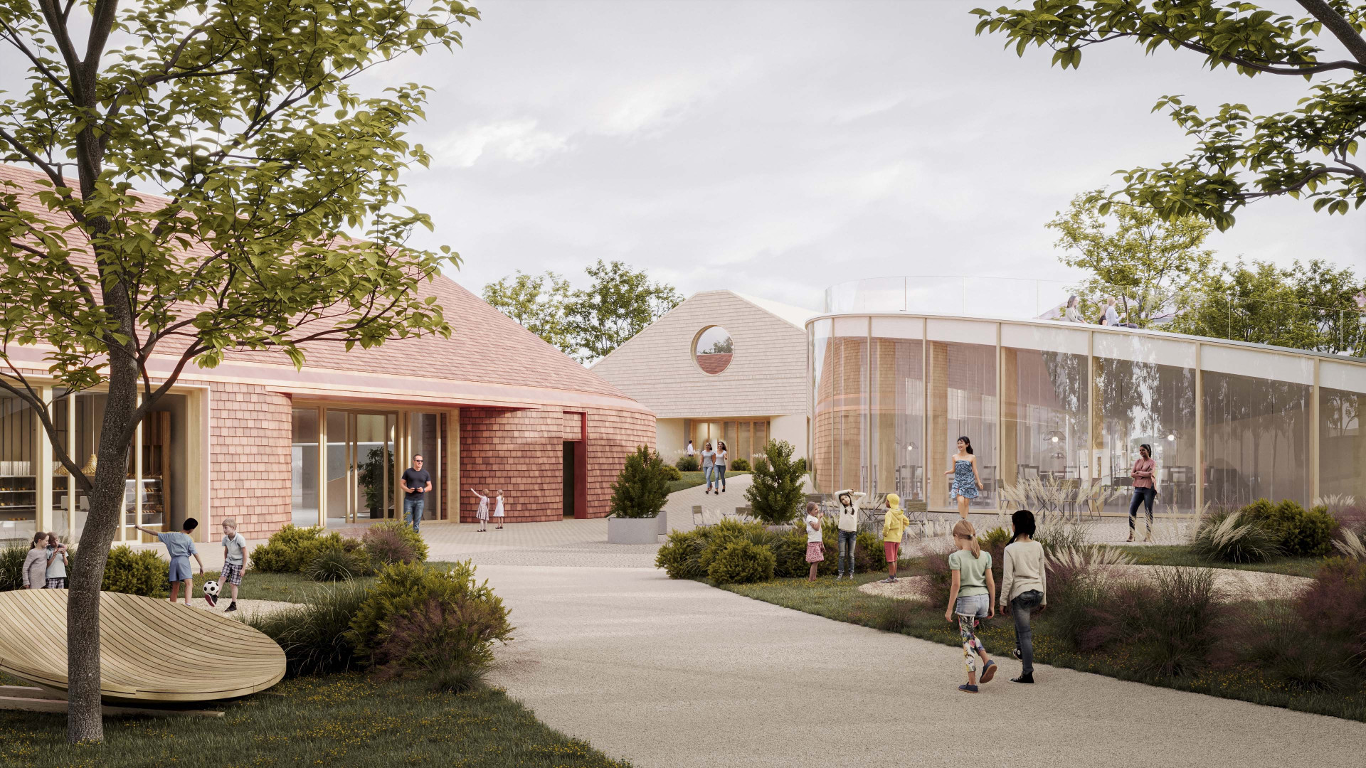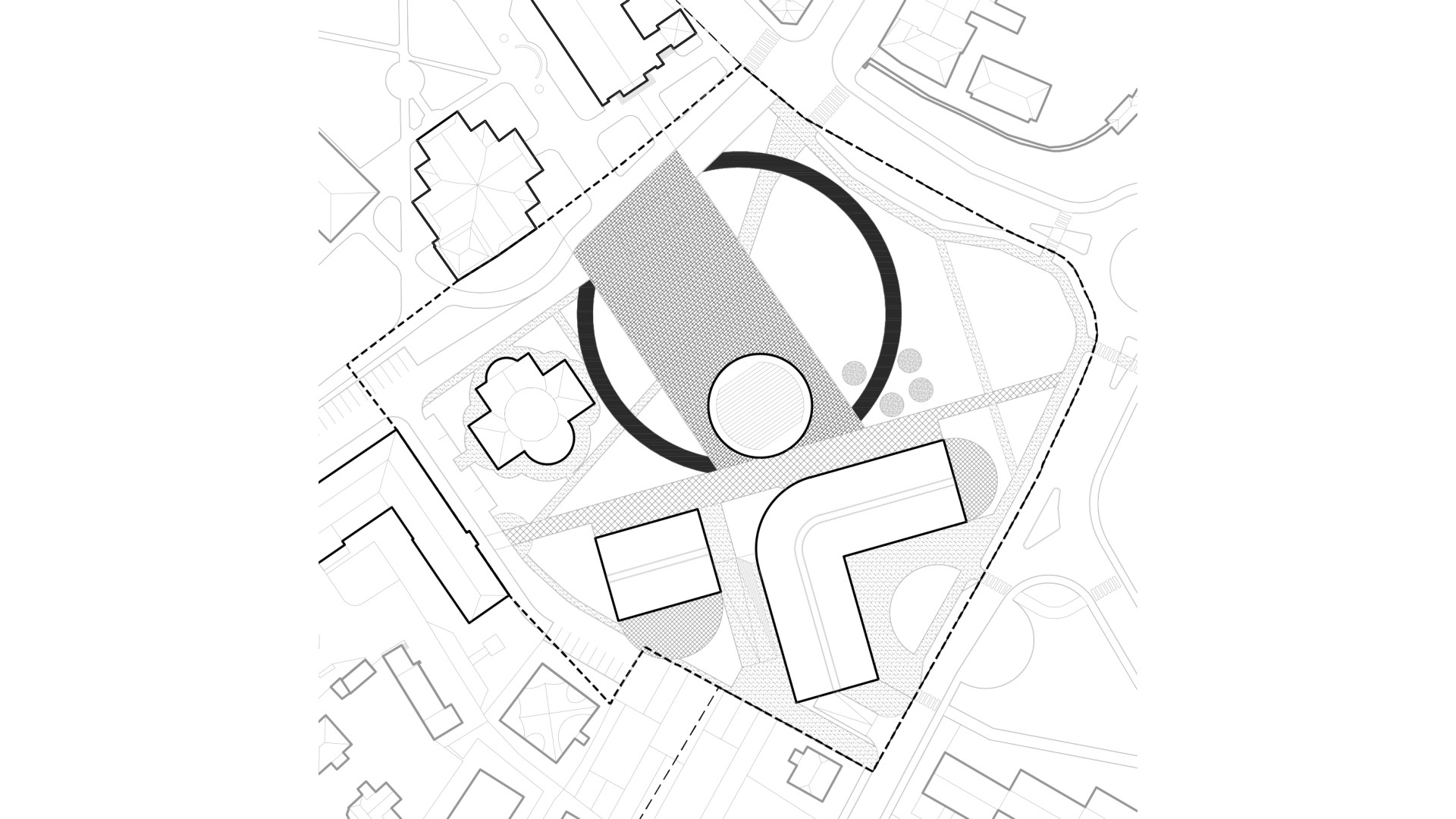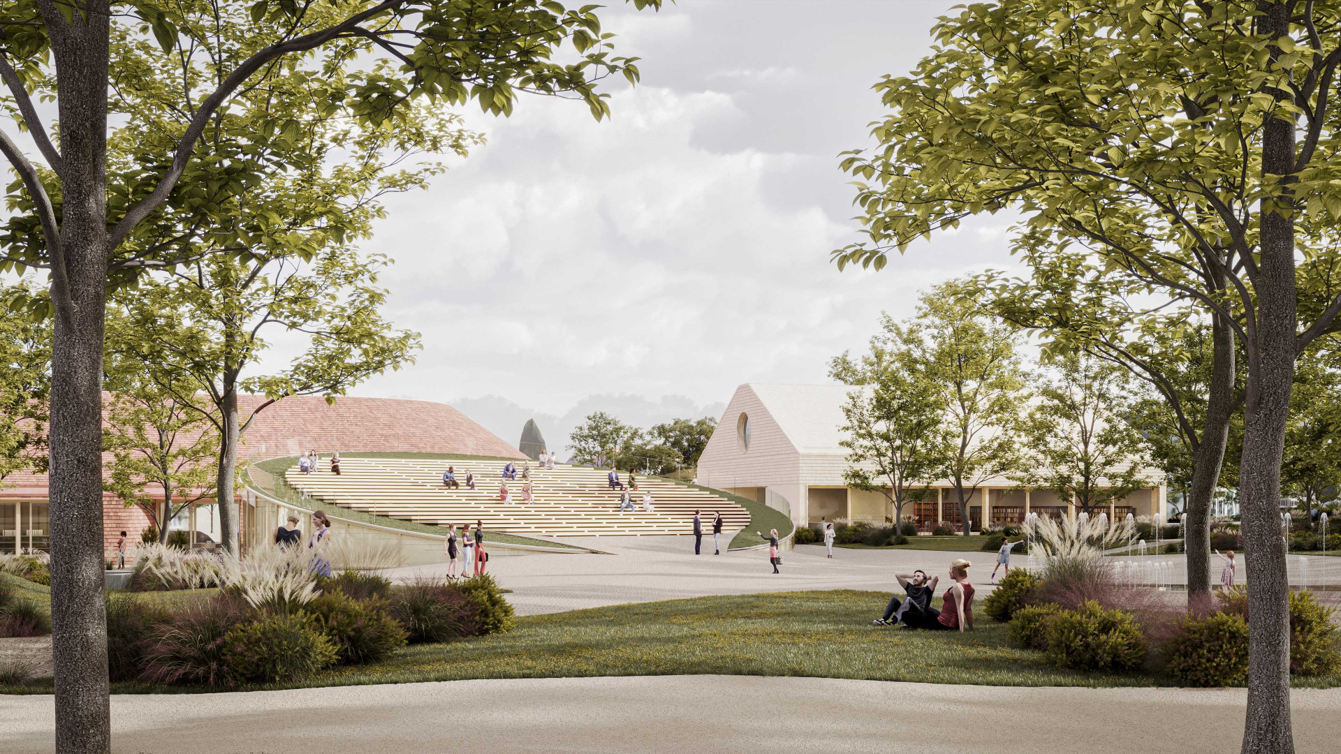 Diagonal connection. The promenade defines the orientation of the cultural and community building, which is framed by smaller interstitial spaces.