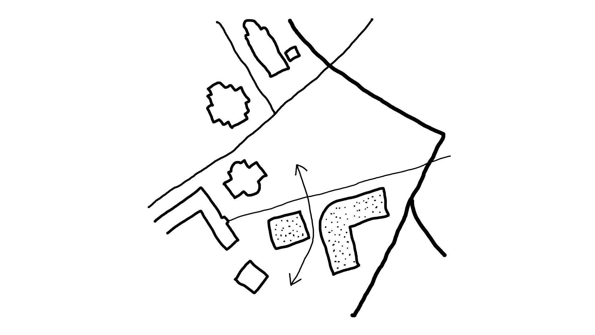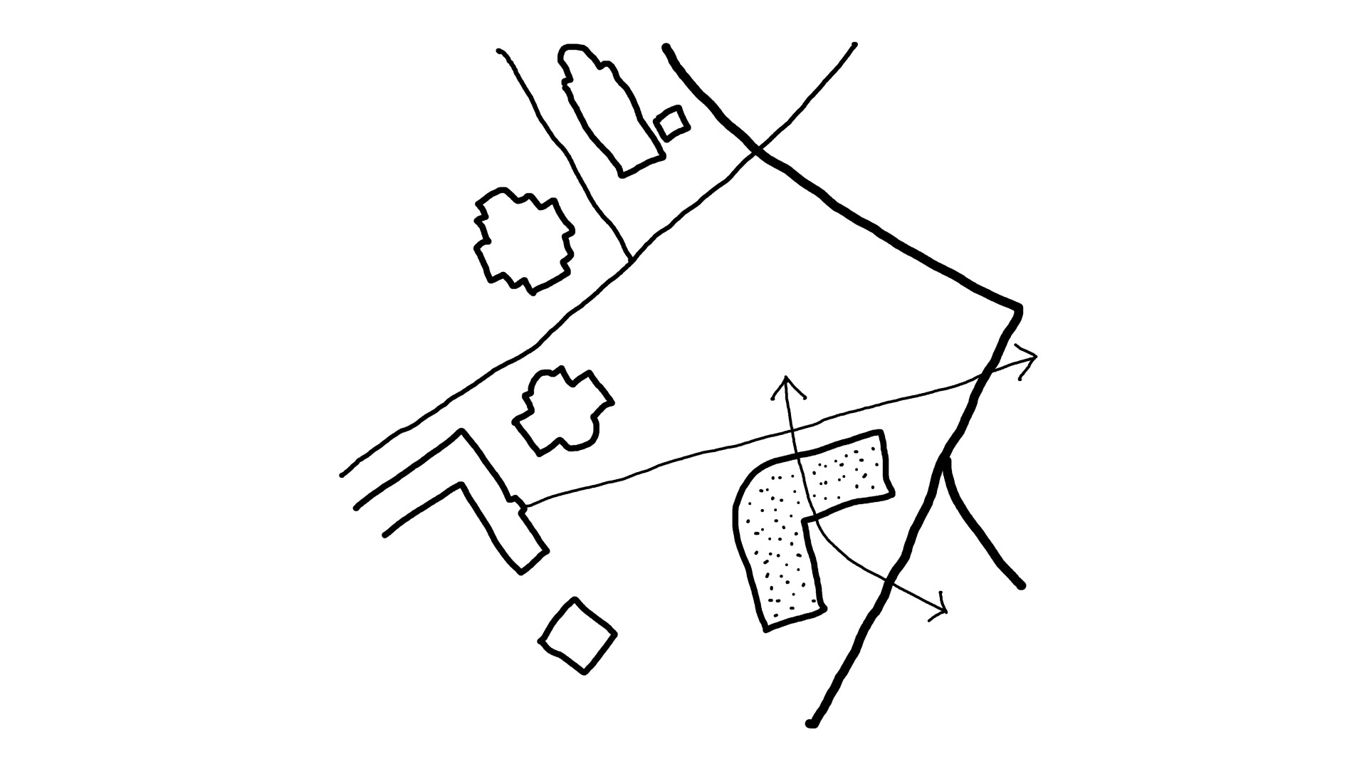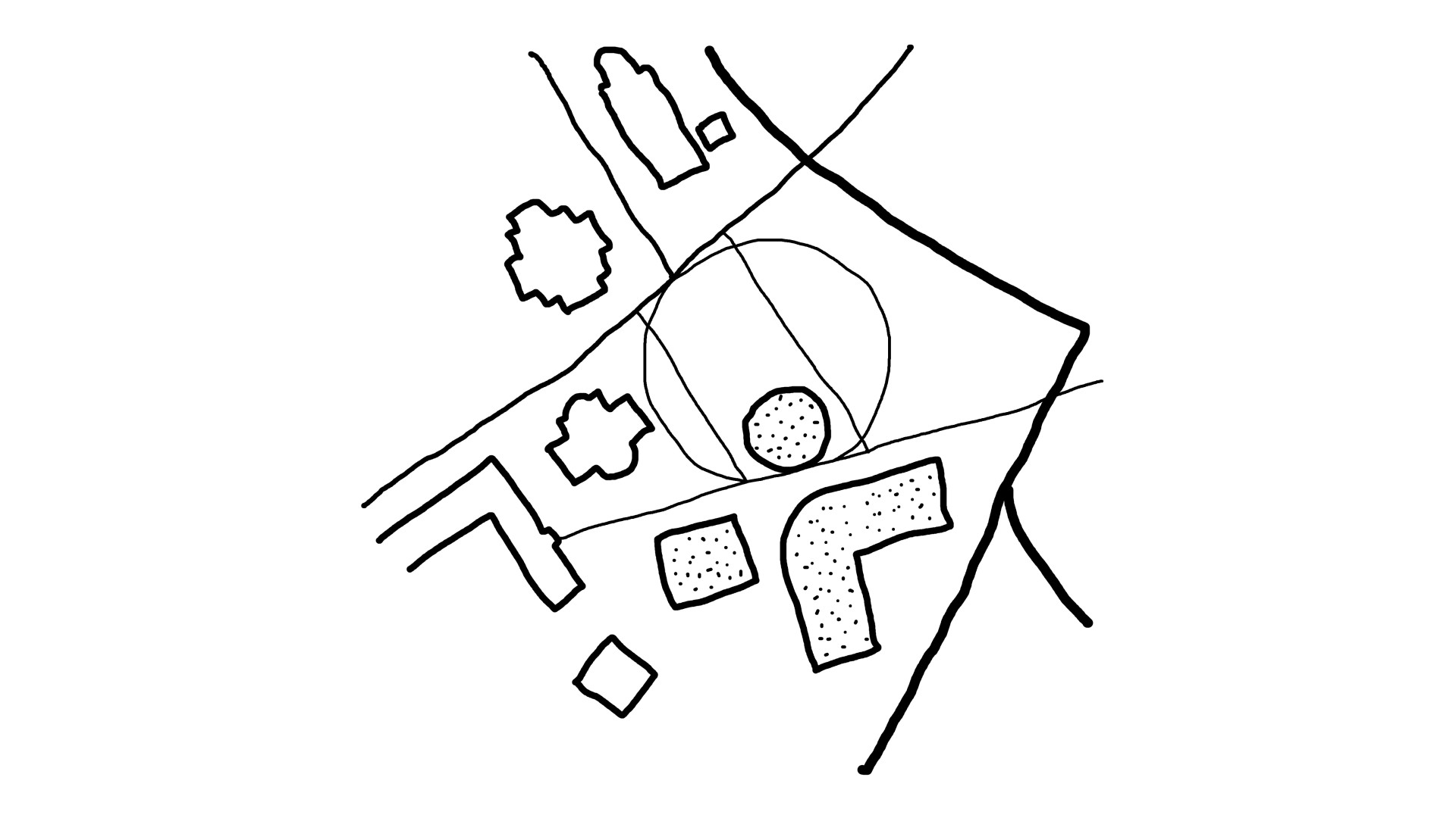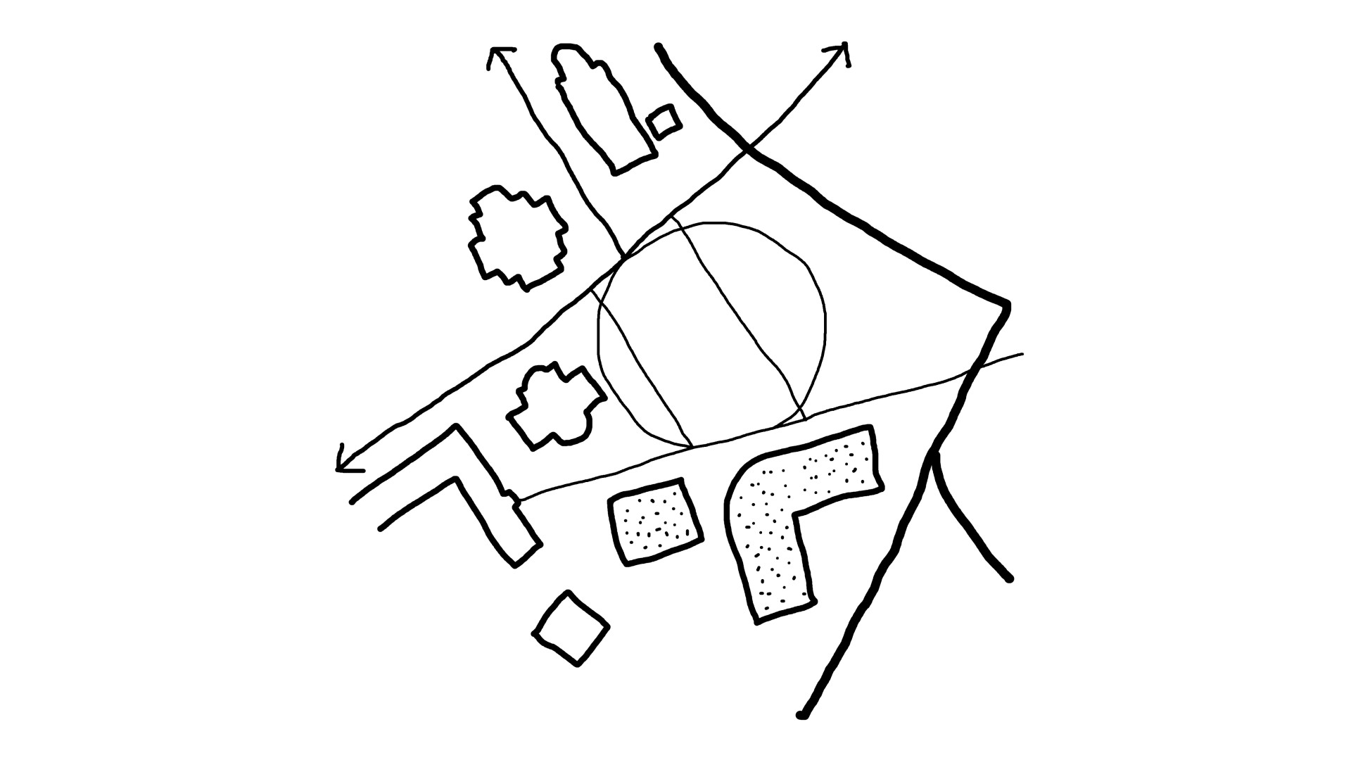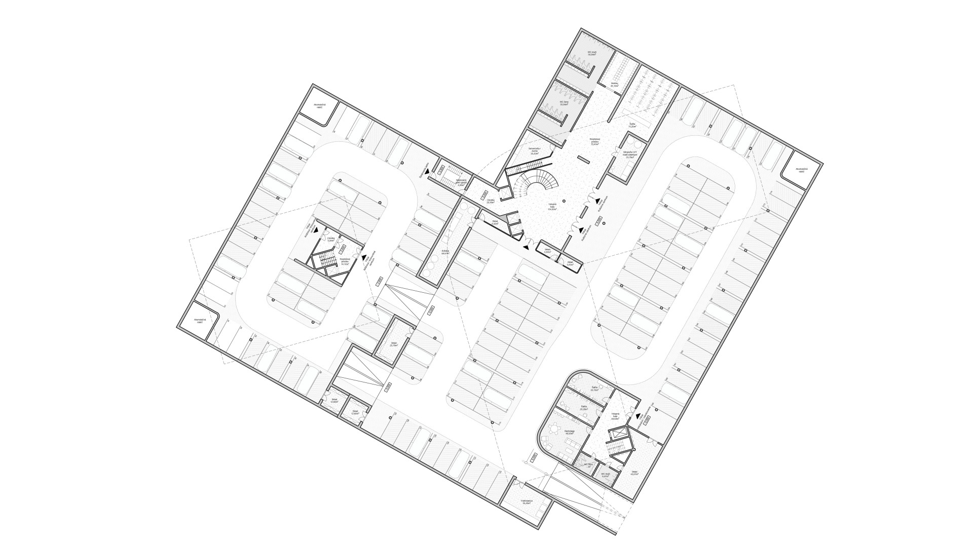 Diagonal connection. The promenade defines the orientation of the cultural and community building, which is framed by smaller interstitial spaces.
