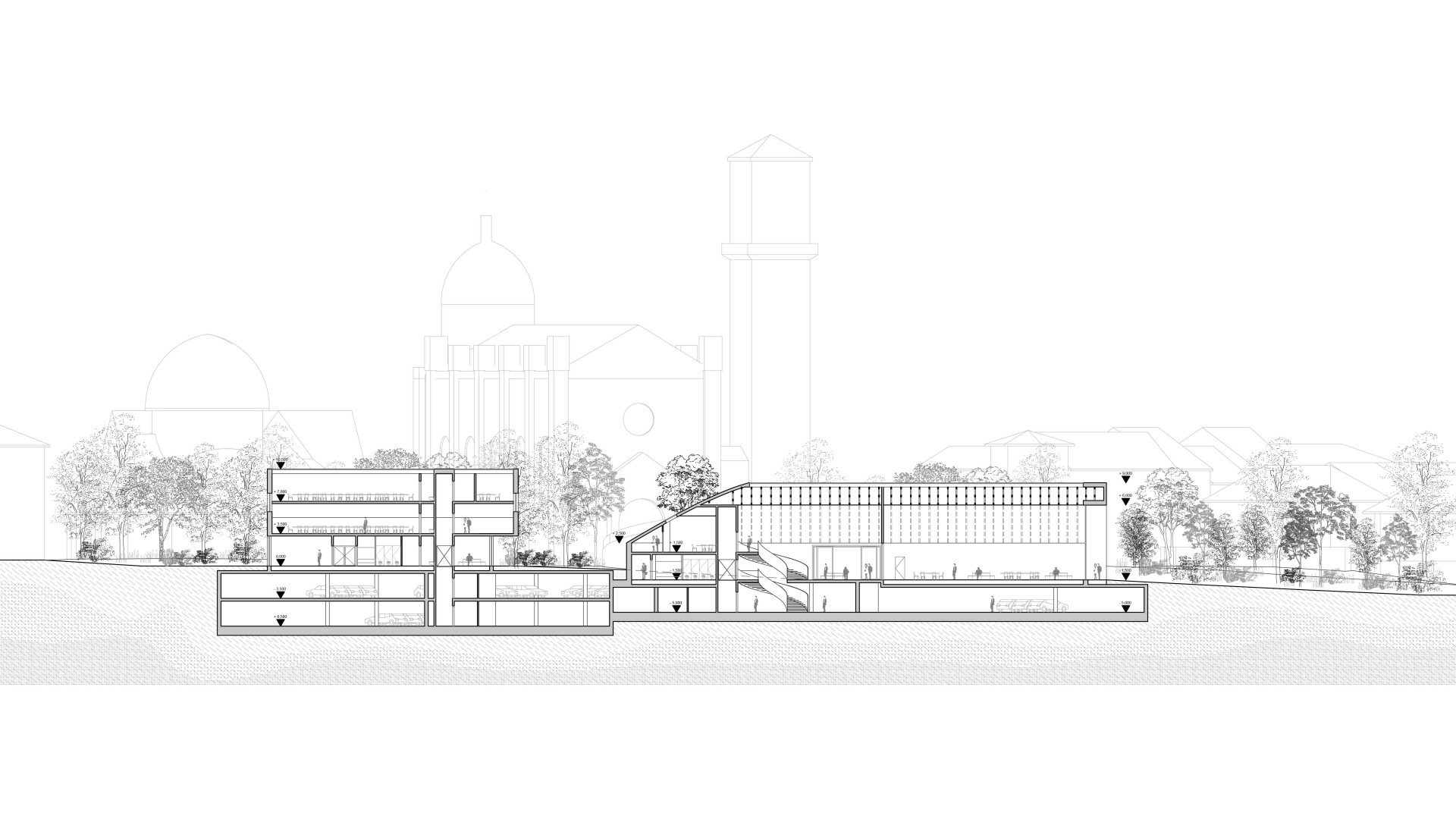 The structural system allows the cultural and community facility to be divided into two phases from a technical standpoint