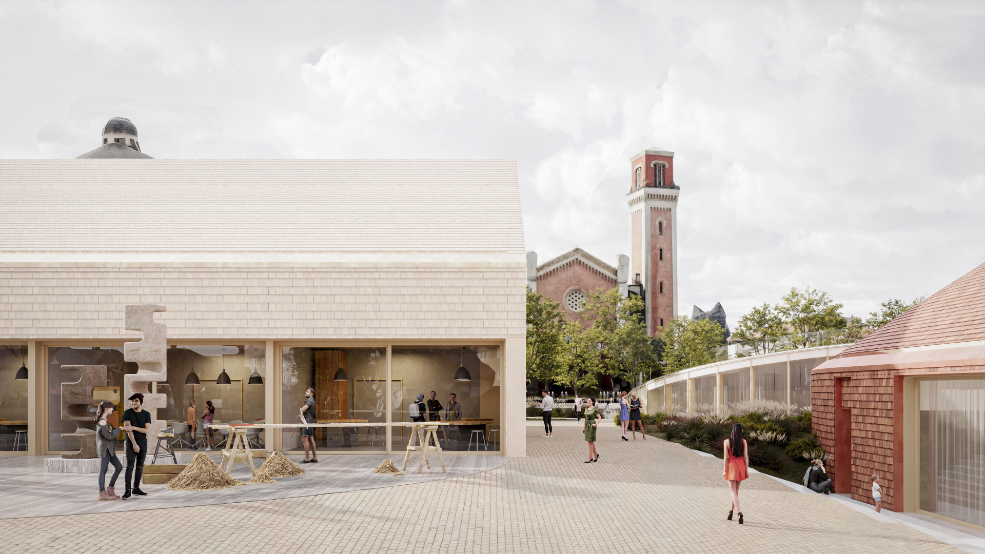 The bistro pavilion serves as a catalyst for activities, facing the park and featuring a rooftop terrace. Orientation: market/churches