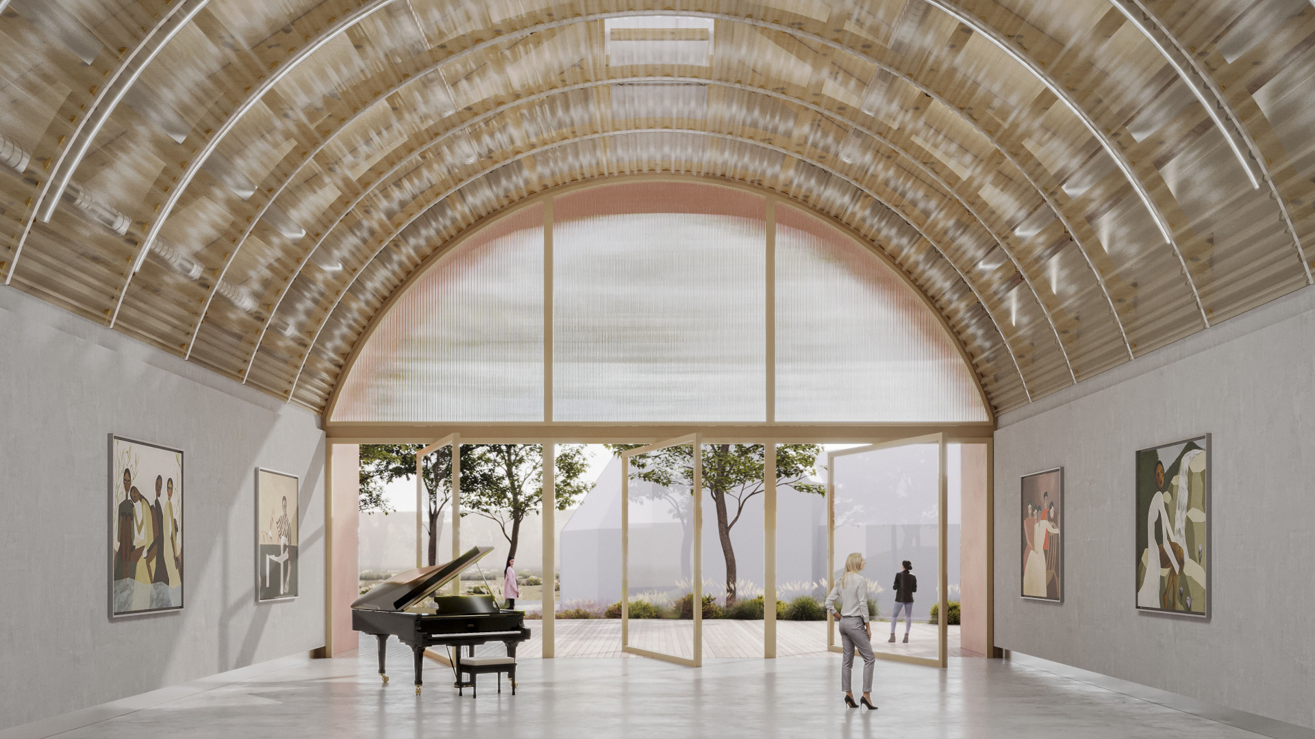 the motif of an abstract wooden vault rendered as a suggestive textile membrane