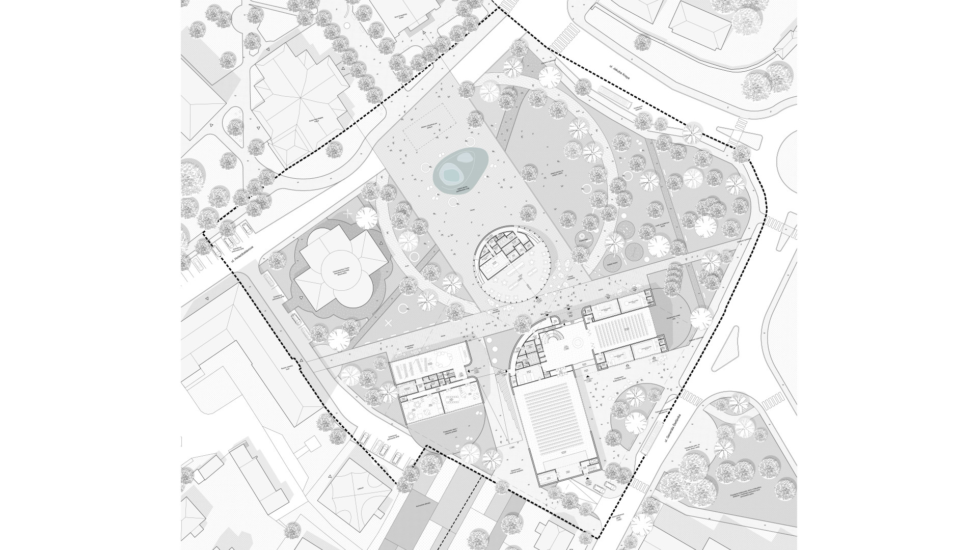 Construction of a central public space—a square and a connecting ring. Planting of greenery, traffic improvements, bike paths, street furniture, and small-scale architectural features.