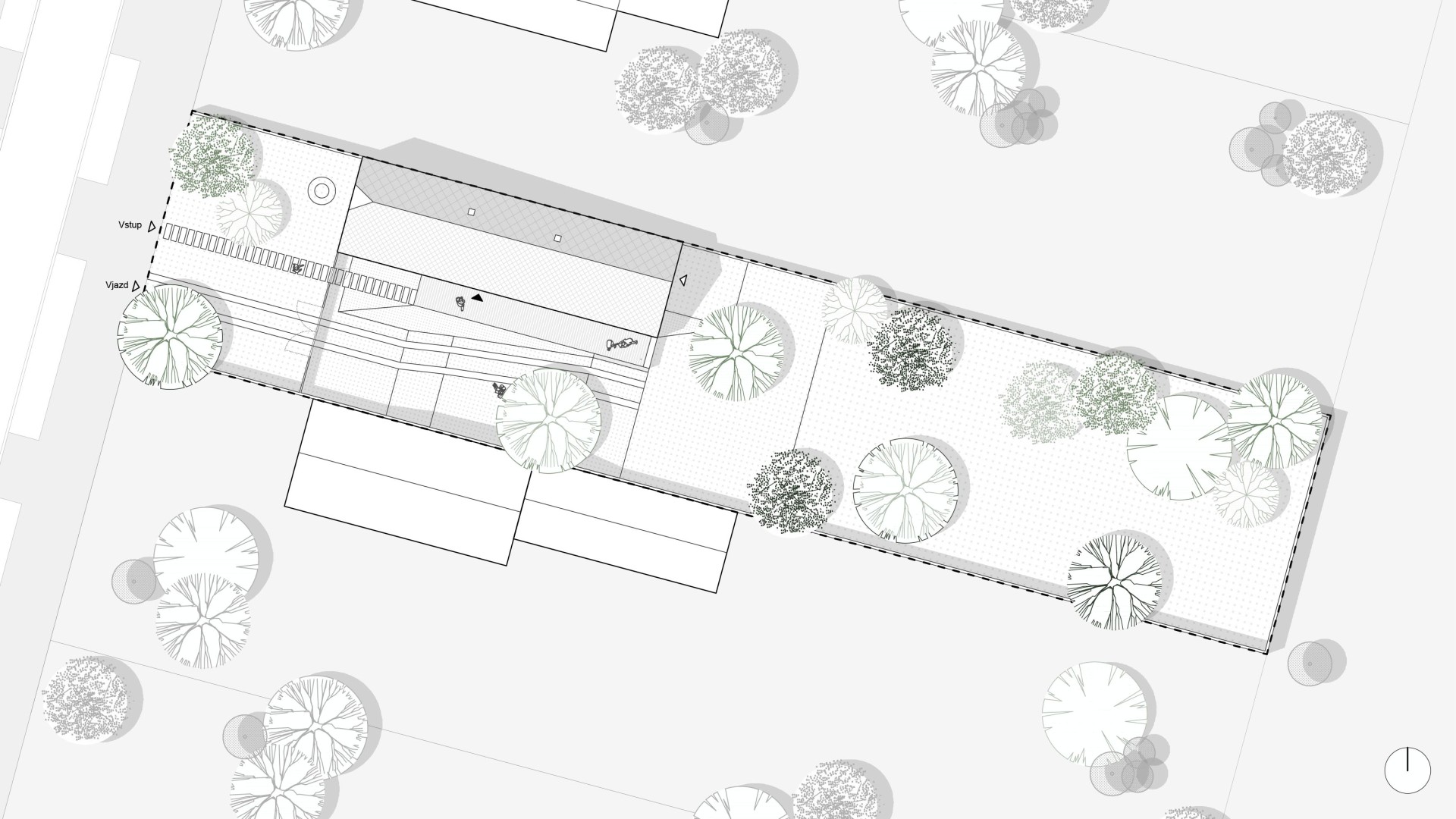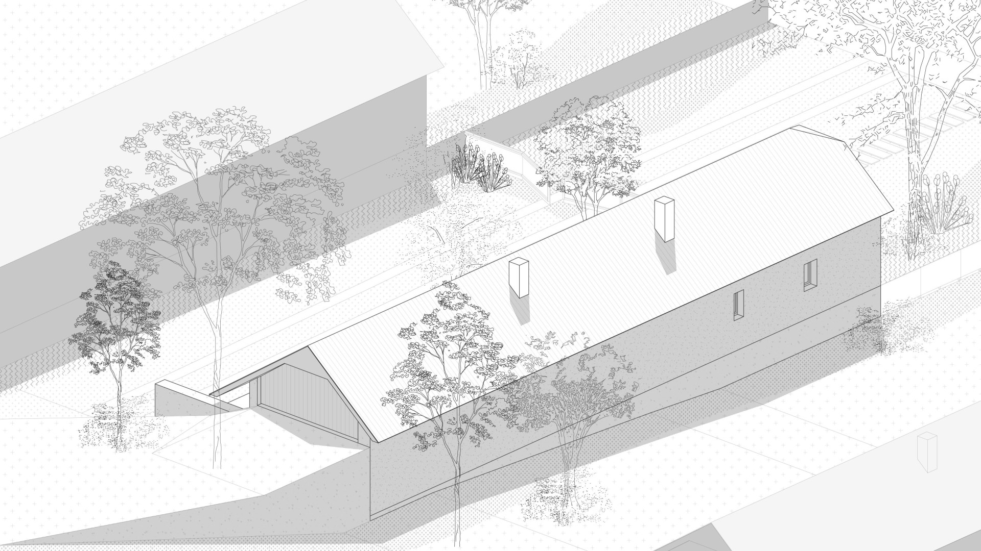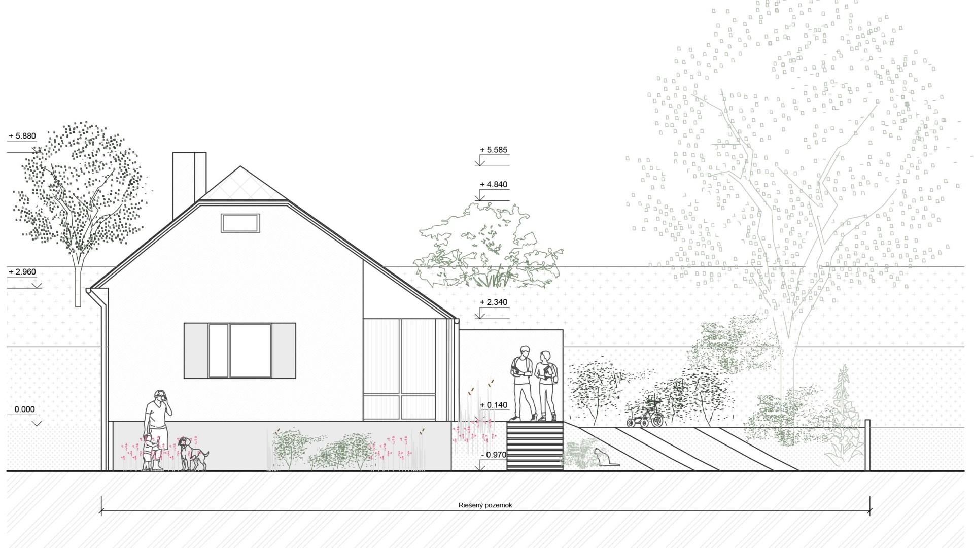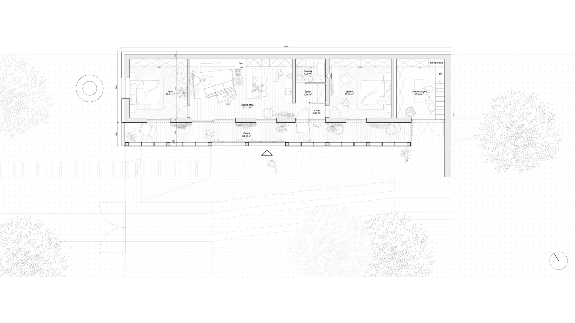 TekovA house with a gánk or gang (as it is known to the author of this text) is a house that can be found in almost every village in the region of Hont and Tekov, for example. It is a house that makes good use of the orientation to the cardinal points and opens out into a functional courtyard, which is usually complemented by a summer kitchen. The gable and the front of the house face the street to the west to maximize light into the evening, and it is usually sheltered from the south by vines that provide shading in the summer months. These principles have been developed through years of observation of nature and are translated into the functional shape of the house, the division of rooms and take into account the needs of its occupant at any given time of the year. In our design, we try to reasonably preserve these givens and improve them with contemporary knowledge and technologies that enhance comfort for contemporary living. We minimize demolition and work with already proven routes of movement through the house in the new room layout, using what is functional and durable. The new layout leaves a central open space with bedrooms to the sides, creating a clear division between day and night areas. We propose to enclose the gable and create a forecourt which will act as a connecting corridor, storage space, conservatory and will be at a different temperature to the exterior, thus avoiding the need to insulate this part of the south elevation. The main entrance is logically right in the centre of the house, where the entrance closet and bathroom are. The panels in front of the living area can be slid to open up the ganey to a wider terrace. We use the material from the demolished structures to create a shallow ramp or staircase for access to the house and to align the ground with the ganek to create a wider terrace and a barrier-free connection to the rear of the property. We are also considering a rainwater storage tank in this development. This extended terrace continues through to the summer kitchen/storage/workshop which is an important part of the house. It is on the site of the original utility area, open to the full height of the house up to the gable roof This location reflects the function of the summer kitchen - a place where cooking, harvesting and DIY takes place for most of the year.