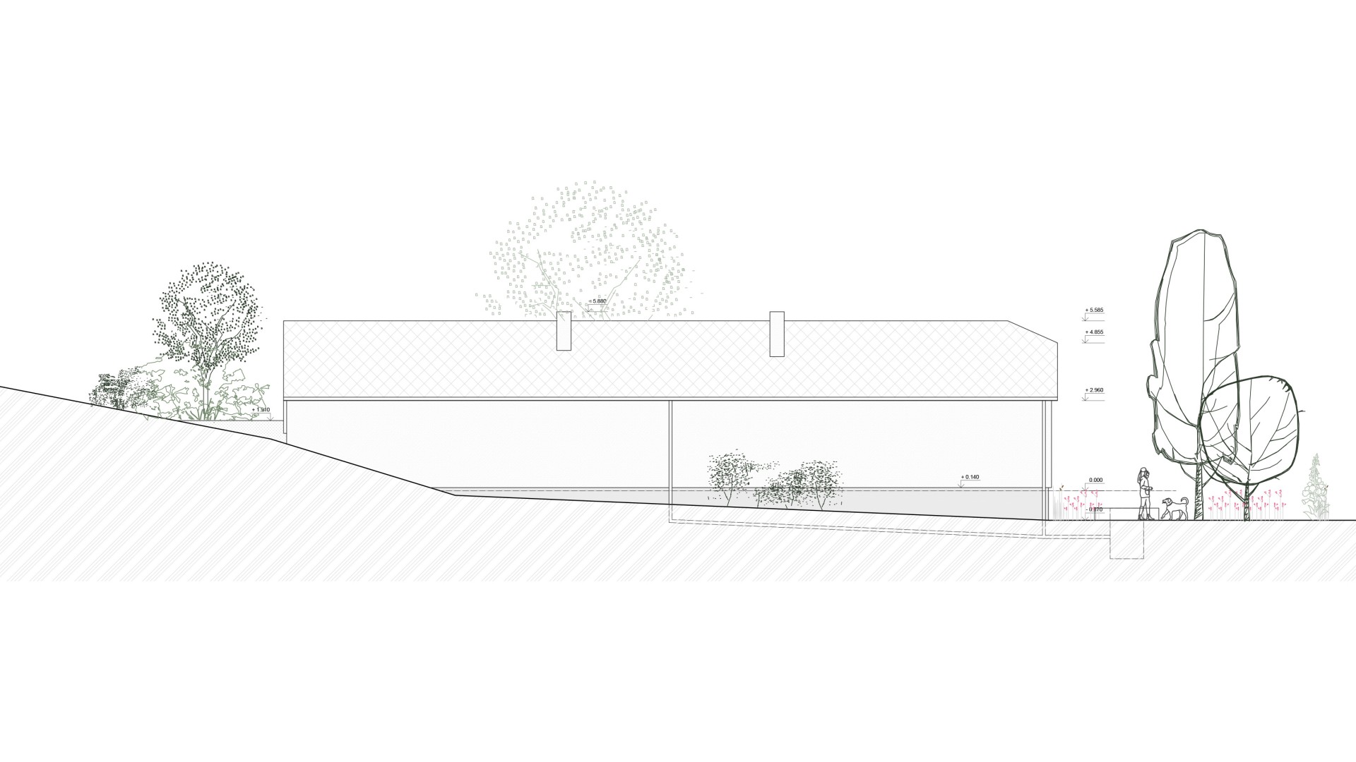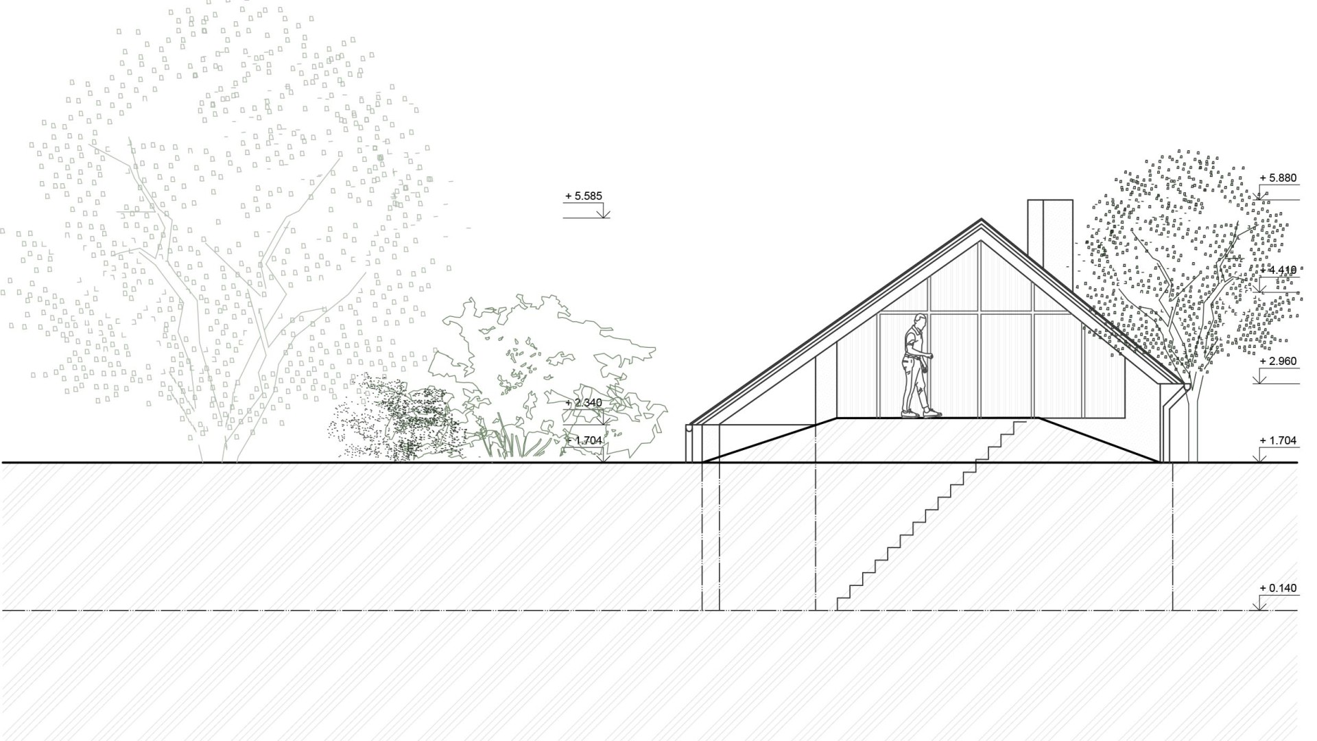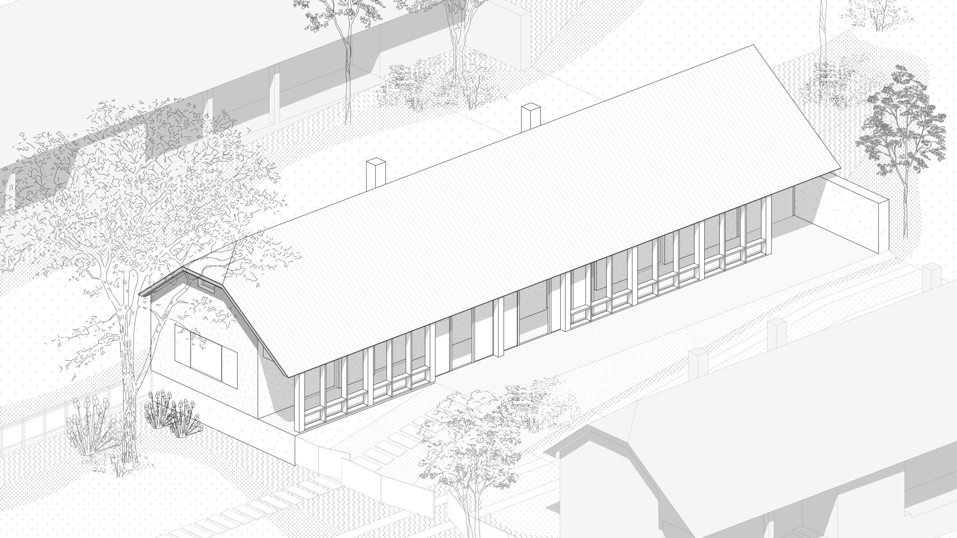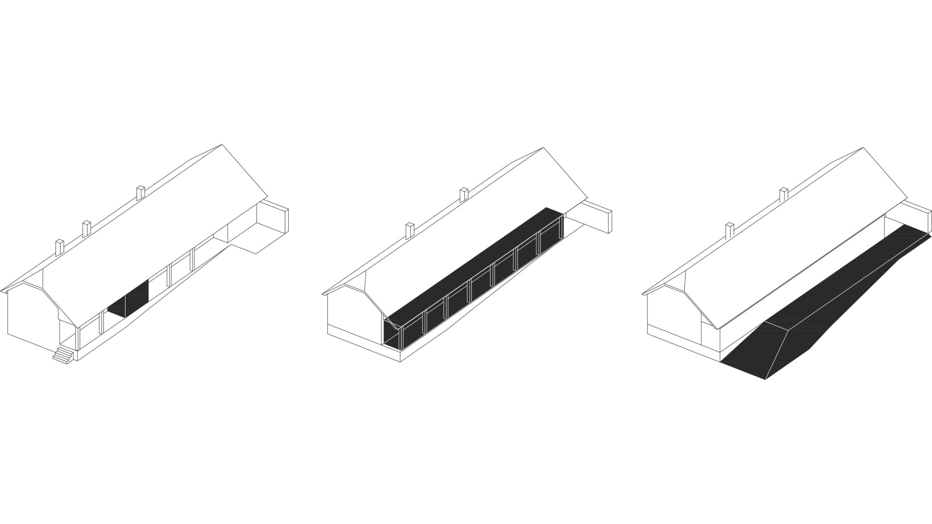 TekovA house with a gánk or gang (as it is known to the author of this text) is a house that can be found in almost every village in the region of Hont and Tekov, for example. It is a house that makes good use of the orientation to the cardinal points and opens out into a functional courtyard, which is usually complemented by a summer kitchen. The gable and the front of the house face the street to the west to maximize light into the evening, and it is usually sheltered from the south by vines that provide shading in the summer months. These principles have been developed through years of observation of nature and are translated into the functional shape of the house, the division of rooms and take into account the needs of its occupant at any given time of the year. In our design, we try to reasonably preserve these givens and improve them with contemporary knowledge and technologies that enhance comfort for contemporary living. We minimize demolition and work with already proven routes of movement through the house in the new room layout, using what is functional and durable. The new layout leaves a central open space with bedrooms to the sides, creating a clear division between day and night areas. We propose to enclose the gable and create a forecourt which will act as a connecting corridor, storage space, conservatory and will be at a different temperature to the exterior, thus avoiding the need to insulate this part of the south elevation. The main entrance is logically right in the centre of the house, where the entrance closet and bathroom are. The panels in front of the living area can be slid to open up the ganey to a wider terrace. We use the material from the demolished structures to create a shallow ramp or staircase for access to the house and to align the ground with the ganek to create a wider terrace and a barrier-free connection to the rear of the property. We are also considering a rainwater storage tank in this development. This extended terrace continues through to the summer kitchen/storage/workshop which is an important part of the house. It is on the site of the original utility area, open to the full height of the house up to the gable roof This location reflects the function of the summer kitchen - a place where cooking, harvesting and DIY takes place for most of the year.