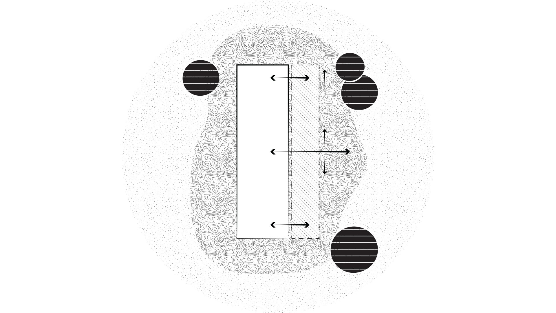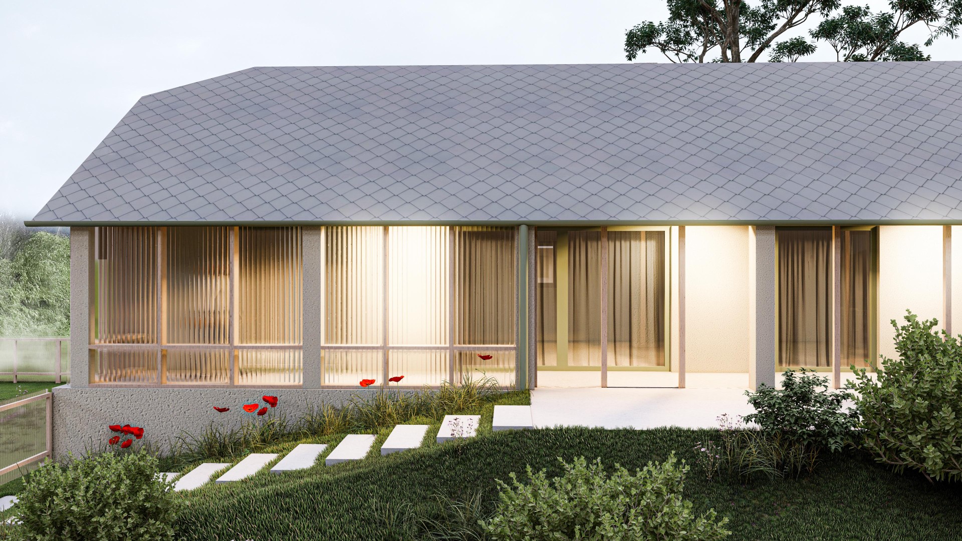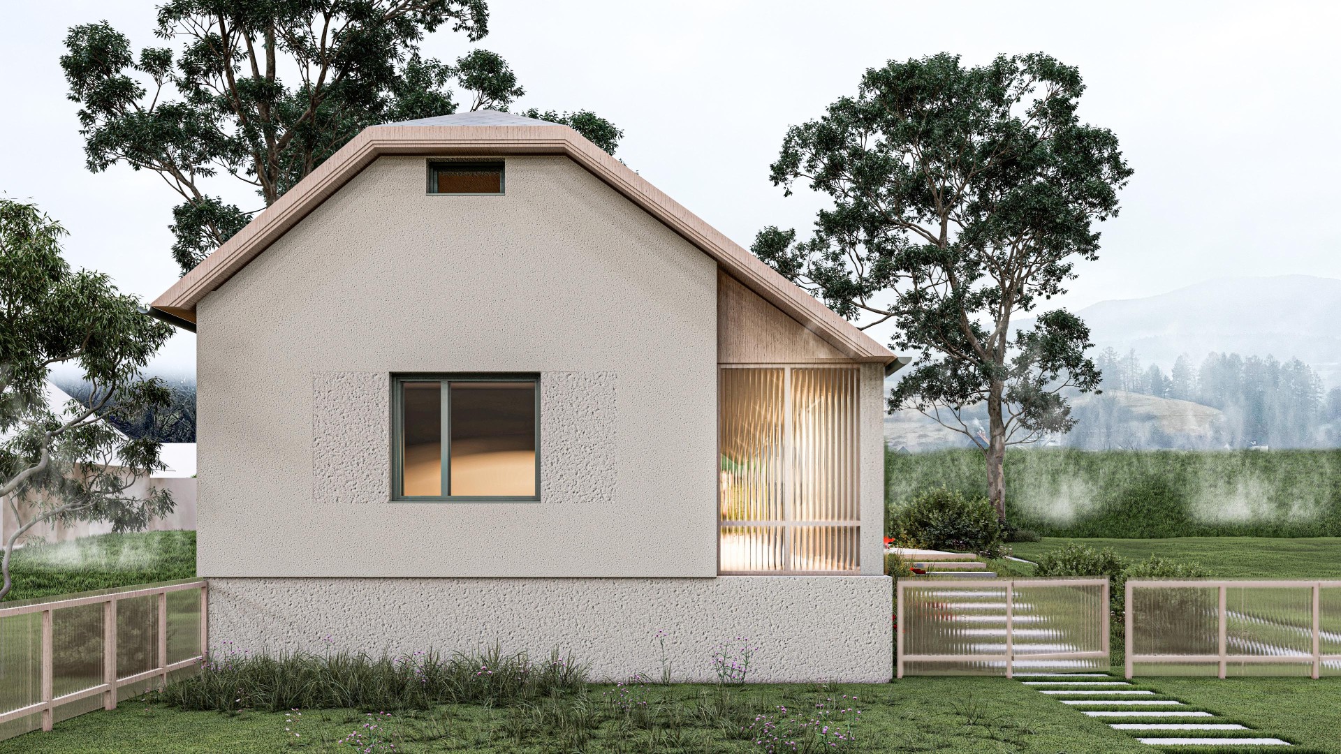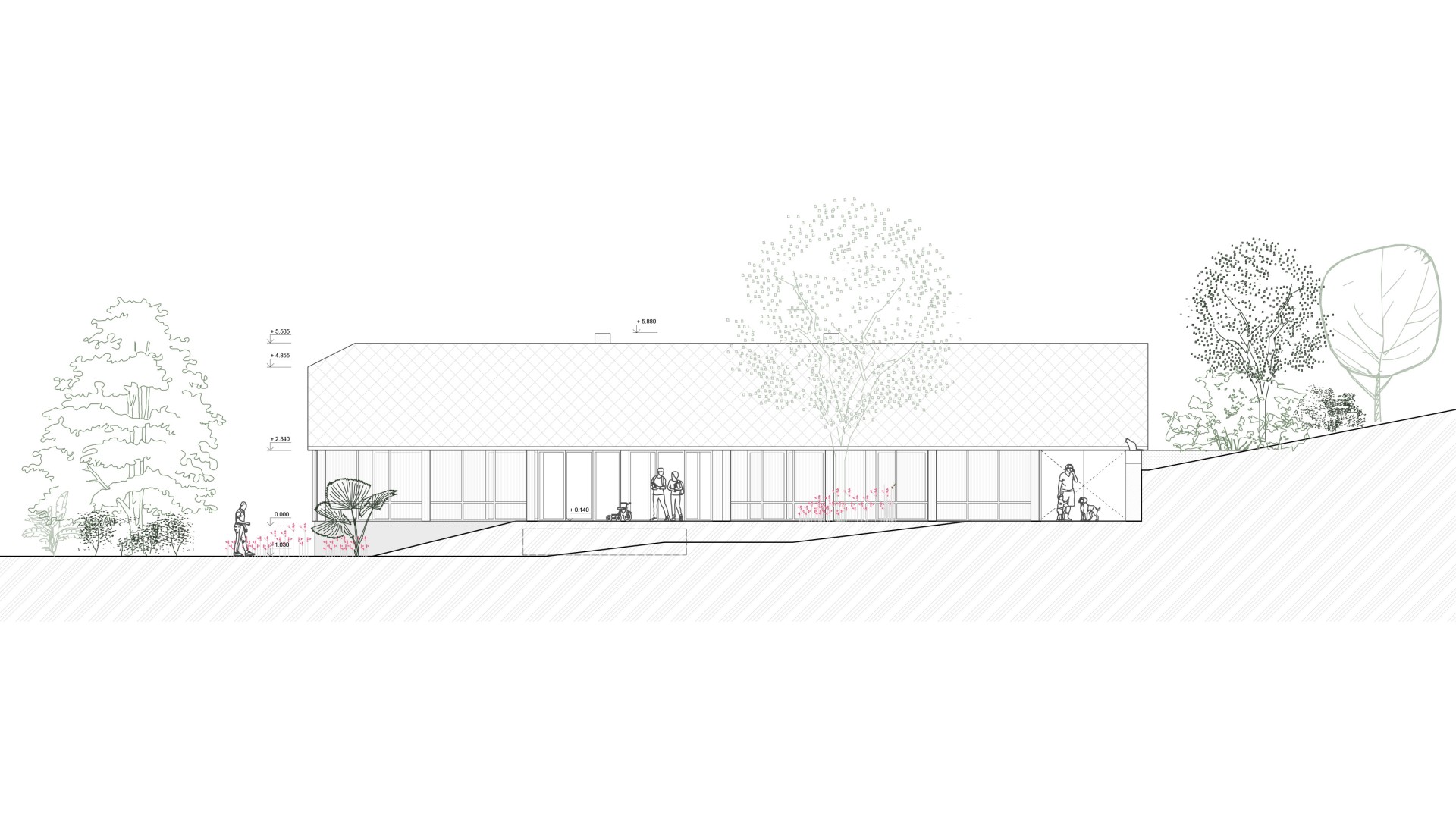 TekovA house with a gánk or gang (as it is known to the author of this text) is a house that can be found in almost every village in the region of Hont and Tekov, for example. It is a house that makes good use of the orientation to the cardinal points and opens out into a functional courtyard, which is usually complemented by a summer kitchen. The gable and the front of the house face the street to the west to maximize light into the evening, and it is usually sheltered from the south by vines that provide shading in the summer months. These principles have been developed through years of observation of nature and are translated into the functional shape of the house, the division of rooms and take into account the needs of its occupant at any given time of the year. In our design, we try to reasonably preserve these givens and improve them with contemporary knowledge and technologies that enhance comfort for contemporary living. We minimize demolition and work with already proven routes of movement through the house in the new room layout, using what is functional and durable. The new layout leaves a central open space with bedrooms to the sides, creating a clear division between day and night areas. We propose to enclose the gable and create a forecourt which will act as a connecting corridor, storage space, conservatory and will be at a different temperature to the exterior, thus avoiding the need to insulate this part of the south elevation. The main entrance is logically right in the centre of the house, where the entrance closet and bathroom are. The panels in front of the living area can be slid to open up the ganey to a wider terrace. We use the material from the demolished structures to create a shallow ramp or staircase for access to the house and to align the ground with the ganek to create a wider terrace and a barrier-free connection to the rear of the property. We are also considering a rainwater storage tank in this development. This extended terrace continues through to the summer kitchen/storage/workshop which is an important part of the house. It is on the site of the original utility area, open to the full height of the house up to the gable roof This location reflects the function of the summer kitchen - a place where cooking, harvesting and DIY takes place for most of the year.