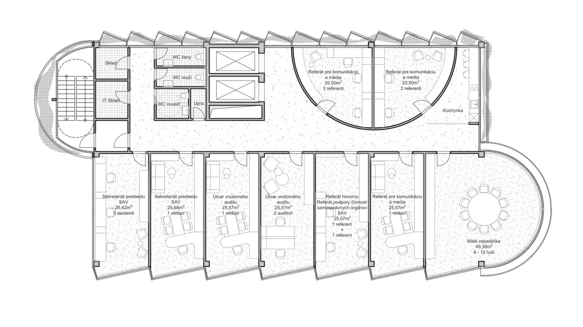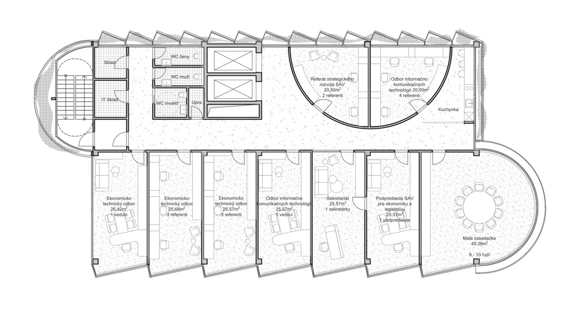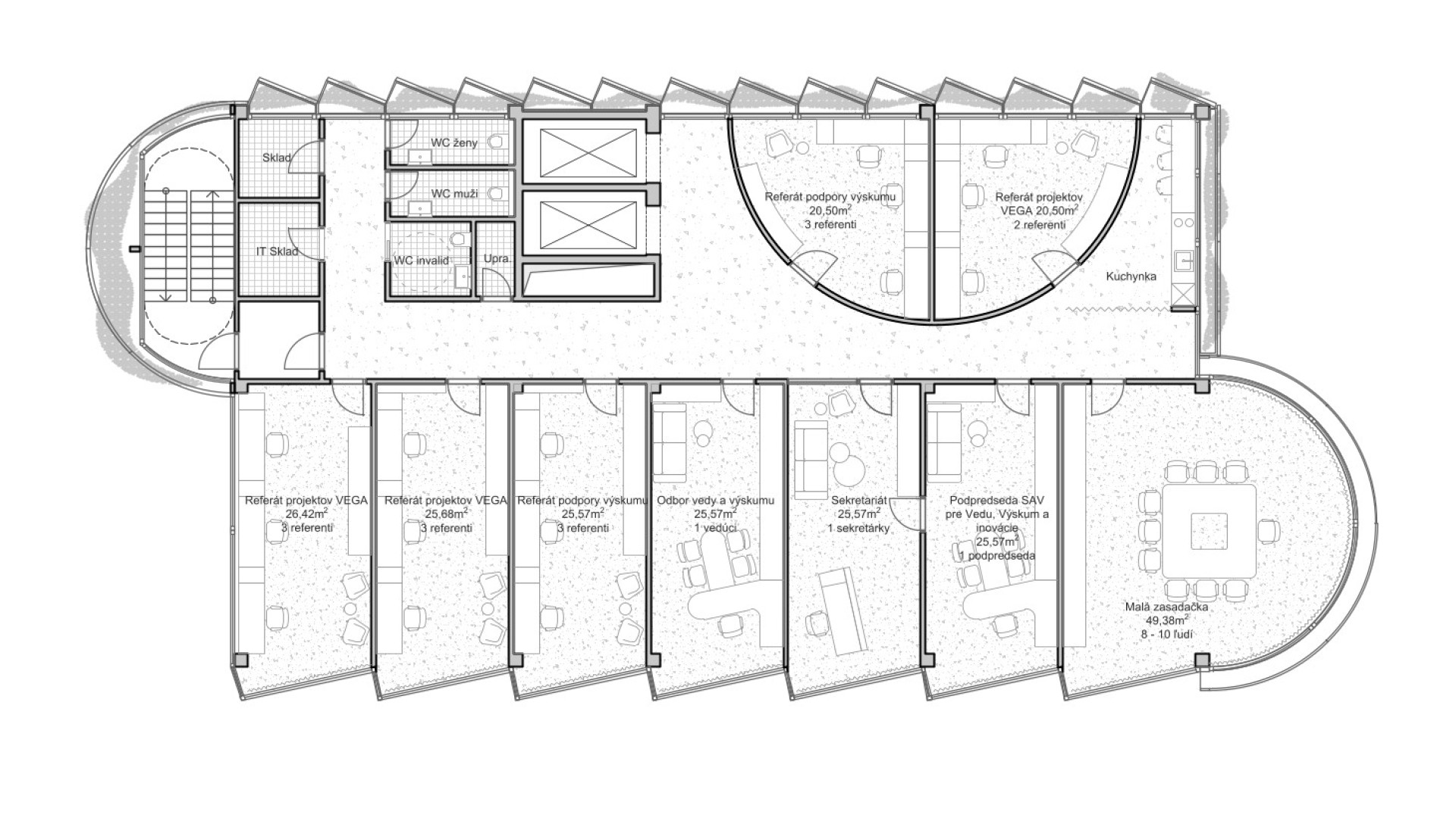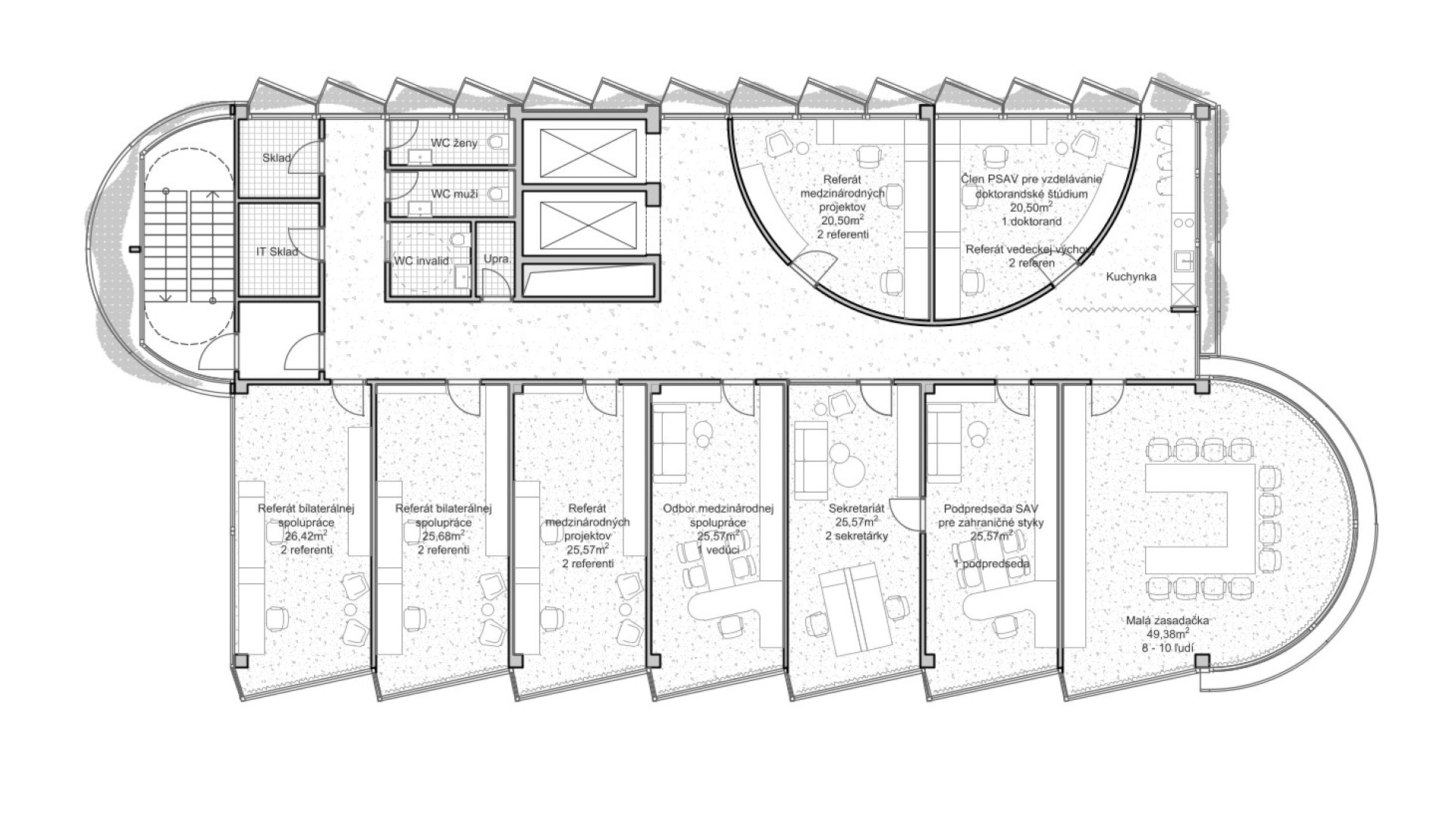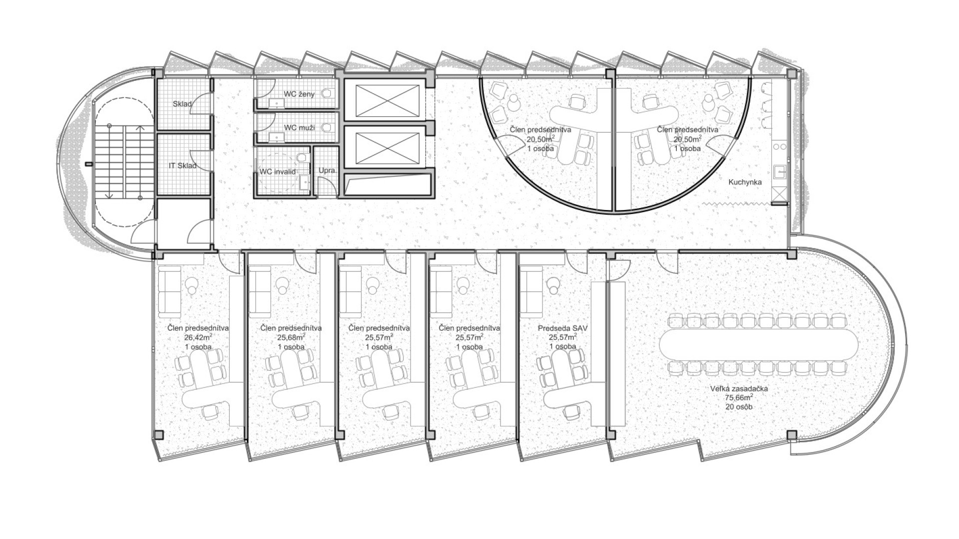 BratislavaThe design concept of the SAV Headquarters building is based on the mutual interaction between internal and external functions within a shared spatial framework. This concept is articulated through three principal themes: context, hierarchy, and interconnection. From an urban planning perspective, the SAV Headquarters completes the counterpart to the vertical mass of the Climate Cluster. The building closes the symmetrical composition in relation to the horizontal superblock to which it is connected. Within the central development area, the building is conceived as a vertical landmark. Its maximum height minimizes site coverage and, as a result, provides a greater amount of public open space. The architectural concept is derived from the fusion of two volumes into a single entity, reflecting the functional and structural division of the double-loaded layout. By shifting the two tracts by one module, a recognizable figure is created within the site while simultaneously establishing an internal spatial hierarchy. On one side, this is expressed through the green staircase core; on the other, through a vertical sequence of interior and exterior meeting rooms articulated toward the central public space of the campus. The vertical offset of the masses is achieved by placing the building technology on the roof of the service tract, discreetly screened by an architectural enclosure. The structural system consists of a reinforced concrete frame with a 7 × 7 metre module, alternatively 3.5 × 7 metres. The staircase core forms a self-supporting structural system. Elevator shafts and service facilities are positioned in the centre of the floor plan. The double-tract structural principle minimizes load-bearing elements and, together with the raised floor system, enables flexible interior layouts. The main tract accommodates offices and corner meeting rooms oriented toward the central public space, while the secondary tract contains service spaces, circulation, and atypical office units. The introduction of irregular office geometries transforms the central corridor into an open and fluid spatial environment. The main entrance to the SAV Headquarters is located beneath the corner meeting rooms, where a covered café terrace is also situated. A secondary entrance adjacent to the staircase provides access to the registry office. The ground floor remains open and visually connected to the surrounding green public space. At ground-floor level, the building is linked to Building No. 24. The working title for the façade expression is “green and glass” — a contrast of soft and rigid, transparent and opaque, living and inert material and volumetric articulation. The lower north-western office tract is fully glazed. The higher south-eastern service tract is clad in perforated metal panels intended to be gradually overgrown with vegetation. This integrated greenery improves the microclimate around the building and serves as a bearer of the cluster’s identity.