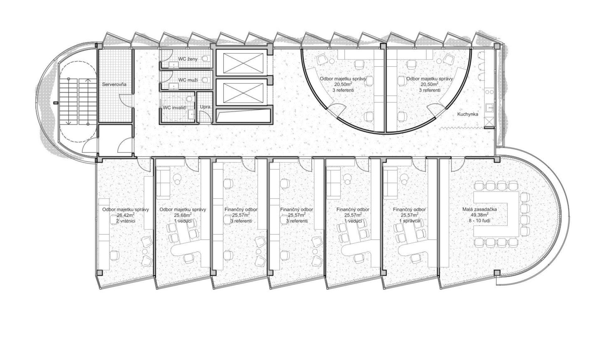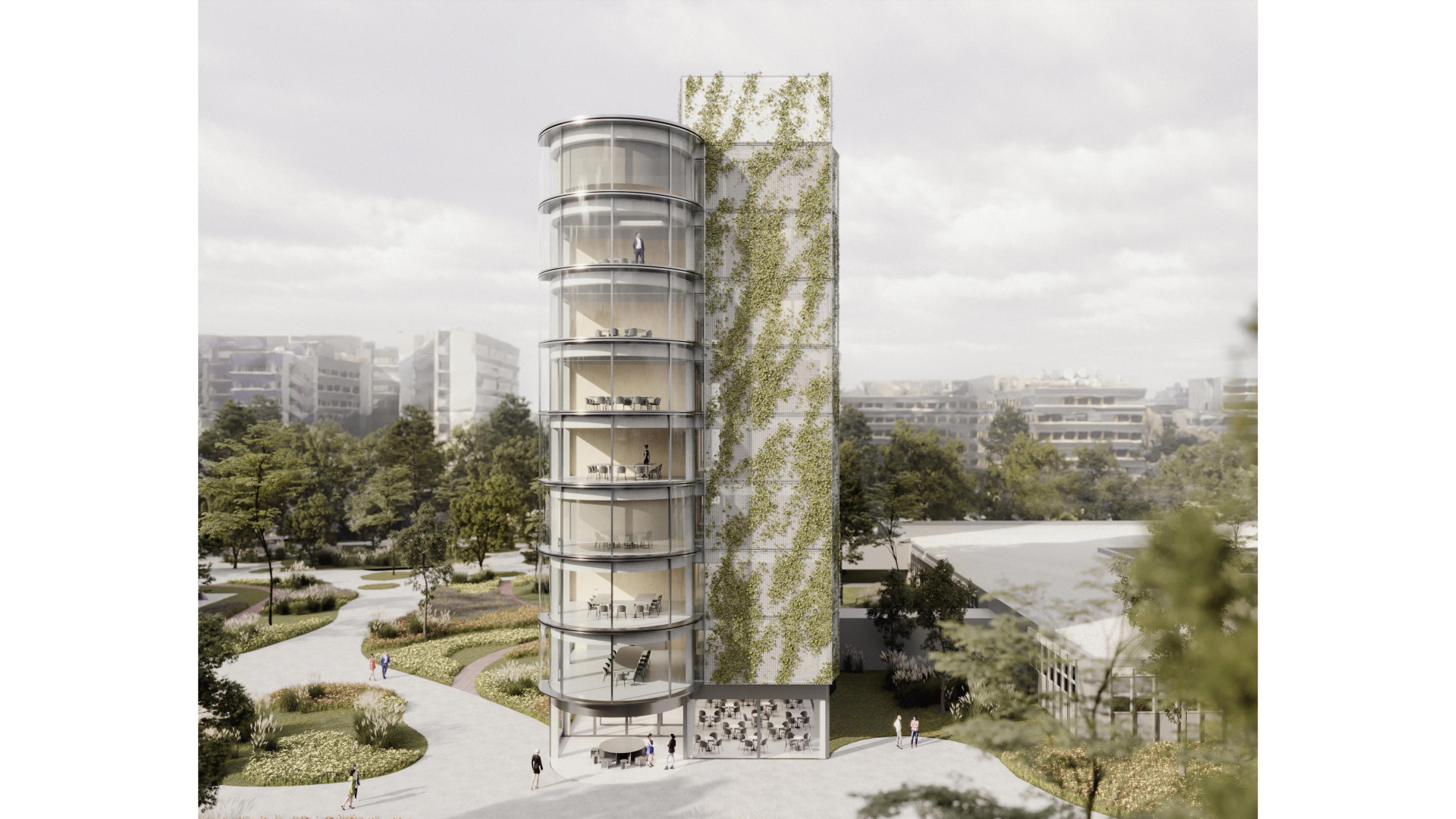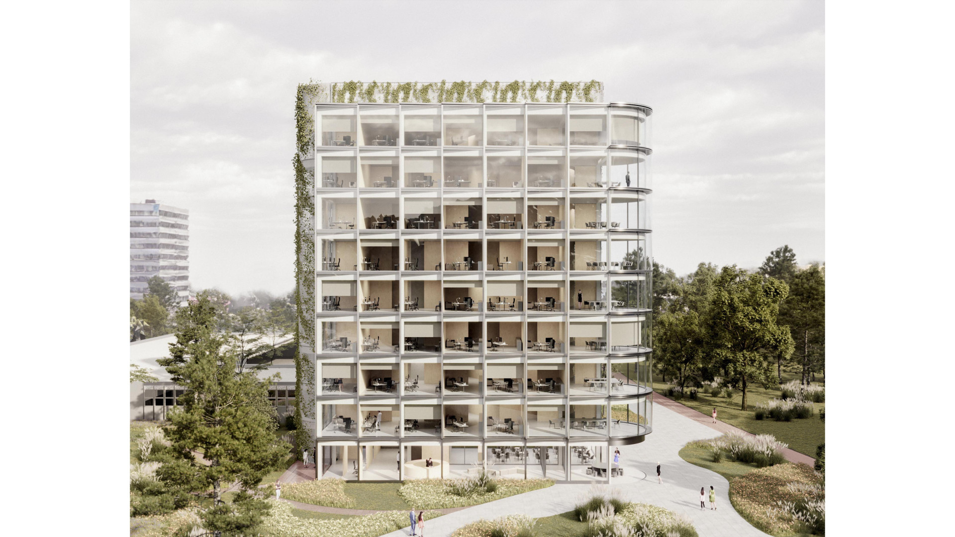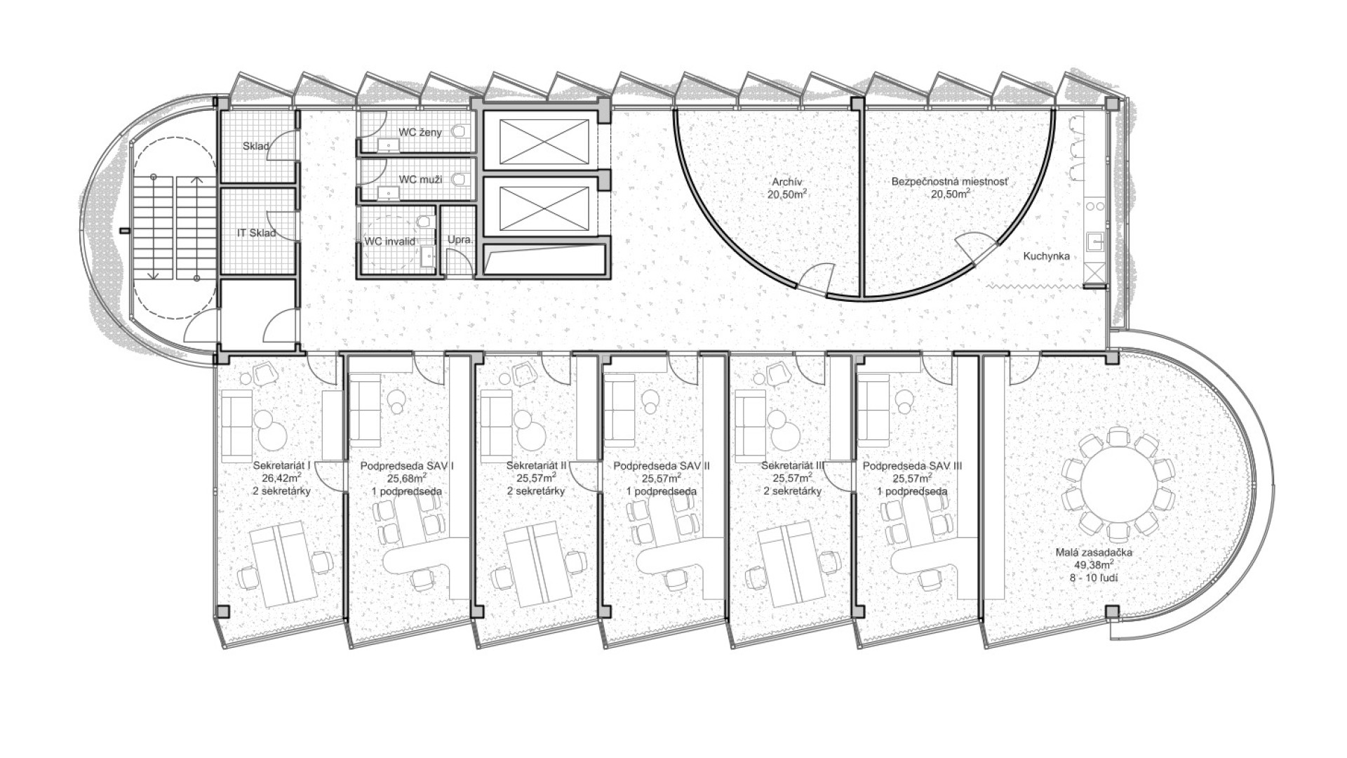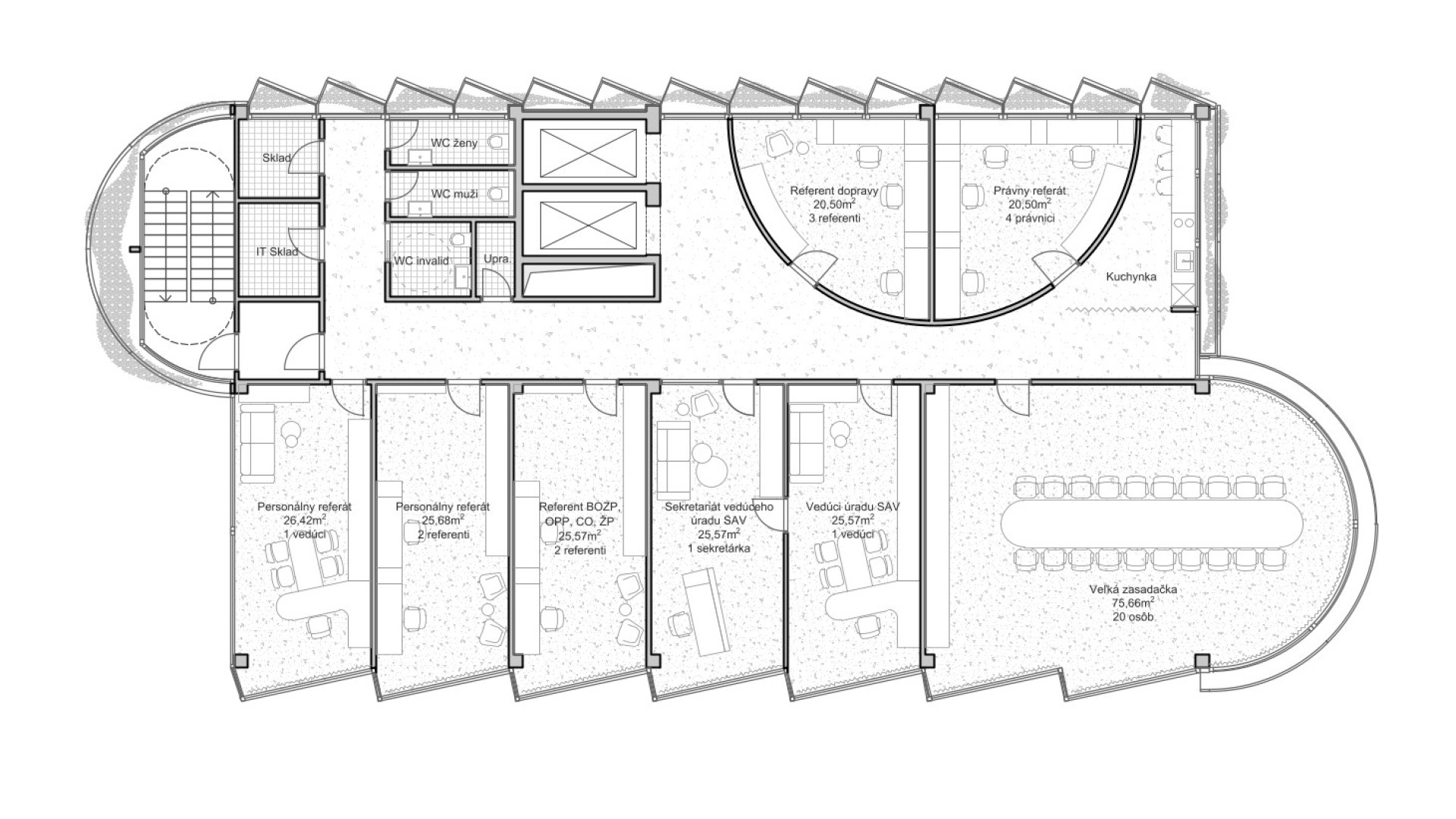 BratislavaThe design concept of the SAV Headquarters building is based on the mutual interaction between internal and external functions within a shared spatial framework. This concept is articulated through three principal themes: context, hierarchy, and interconnection. From an urban planning perspective, the SAV Headquarters completes the counterpart to the vertical mass of the Climate Cluster. The building closes the symmetrical composition in relation to the horizontal superblock to which it is connected. Within the central development area, the building is conceived as a vertical landmark. Its maximum height minimizes site coverage and, as a result, provides a greater amount of public open space. The architectural concept is derived from the fusion of two volumes into a single entity, reflecting the functional and structural division of the double-loaded layout. By shifting the two tracts by one module, a recognizable figure is created within the site while simultaneously establishing an internal spatial hierarchy. On one side, this is expressed through the green staircase core; on the other, through a vertical sequence of interior and exterior meeting rooms articulated toward the central public space of the campus. The vertical offset of the masses is achieved by placing the building technology on the roof of the service tract, discreetly screened by an architectural enclosure. The structural system consists of a reinforced concrete frame with a 7 × 7 metre module, alternatively 3.5 × 7 metres. The staircase core forms a self-supporting structural system. Elevator shafts and service facilities are positioned in the centre of the floor plan. The double-tract structural principle minimizes load-bearing elements and, together with the raised floor system, enables flexible interior layouts. The main tract accommodates offices and corner meeting rooms oriented toward the central public space, while the secondary tract contains service spaces, circulation, and atypical office units. The introduction of irregular office geometries transforms the central corridor into an open and fluid spatial environment. The main entrance to the SAV Headquarters is located beneath the corner meeting rooms, where a covered café terrace is also situated. A secondary entrance adjacent to the staircase provides access to the registry office. The ground floor remains open and visually connected to the surrounding green public space. At ground-floor level, the building is linked to Building No. 24. The working title for the façade expression is “green and glass” — a contrast of soft and rigid, transparent and opaque, living and inert material and volumetric articulation. The lower north-western office tract is fully glazed. The higher south-eastern service tract is clad in perforated metal panels intended to be gradually overgrown with vegetation. This integrated greenery improves the microclimate around the building and serves as a bearer of the cluster’s identity.