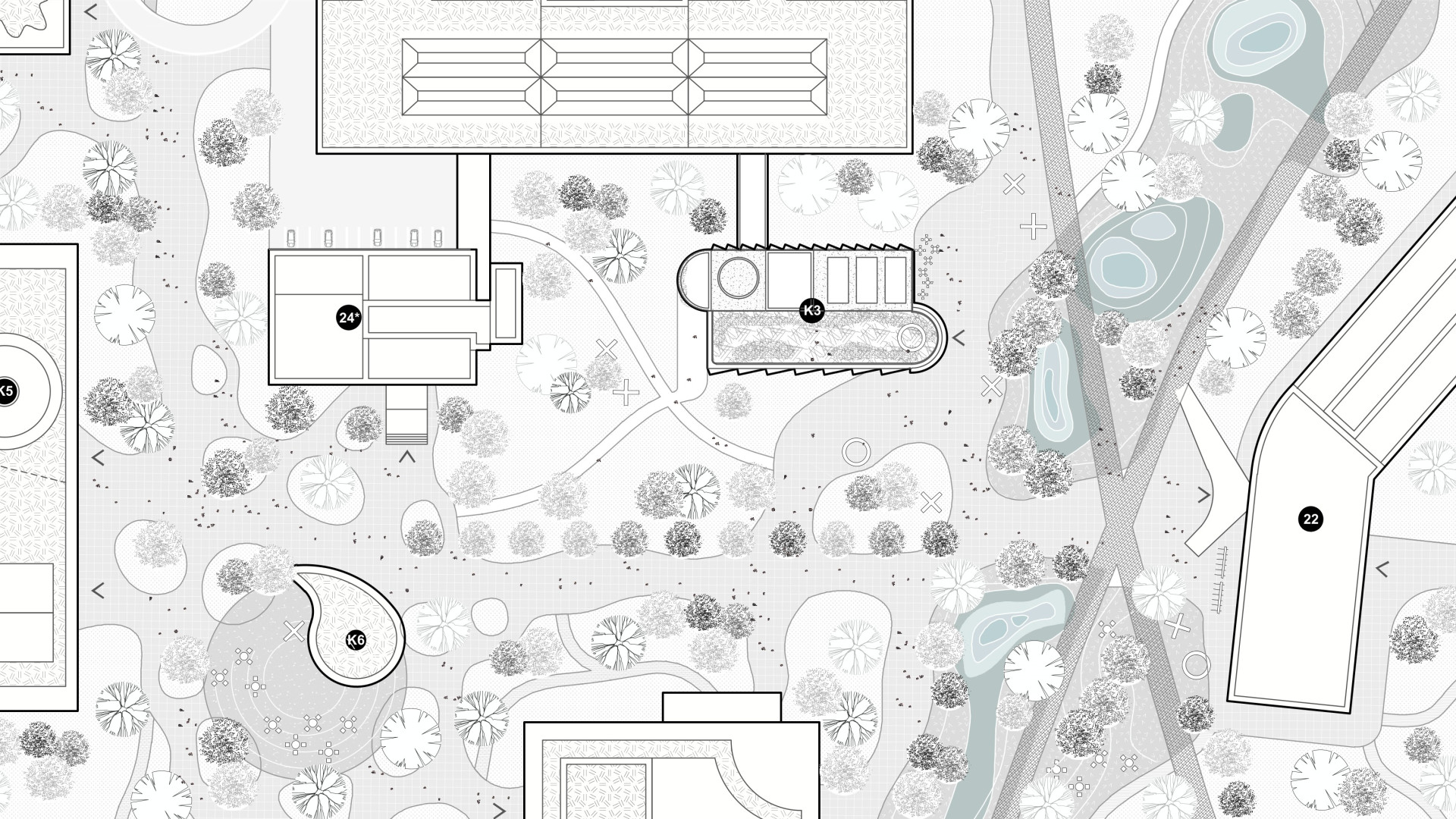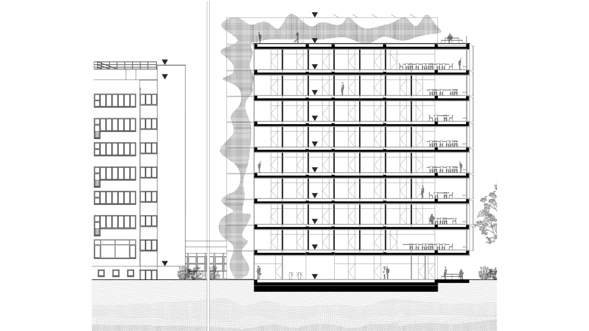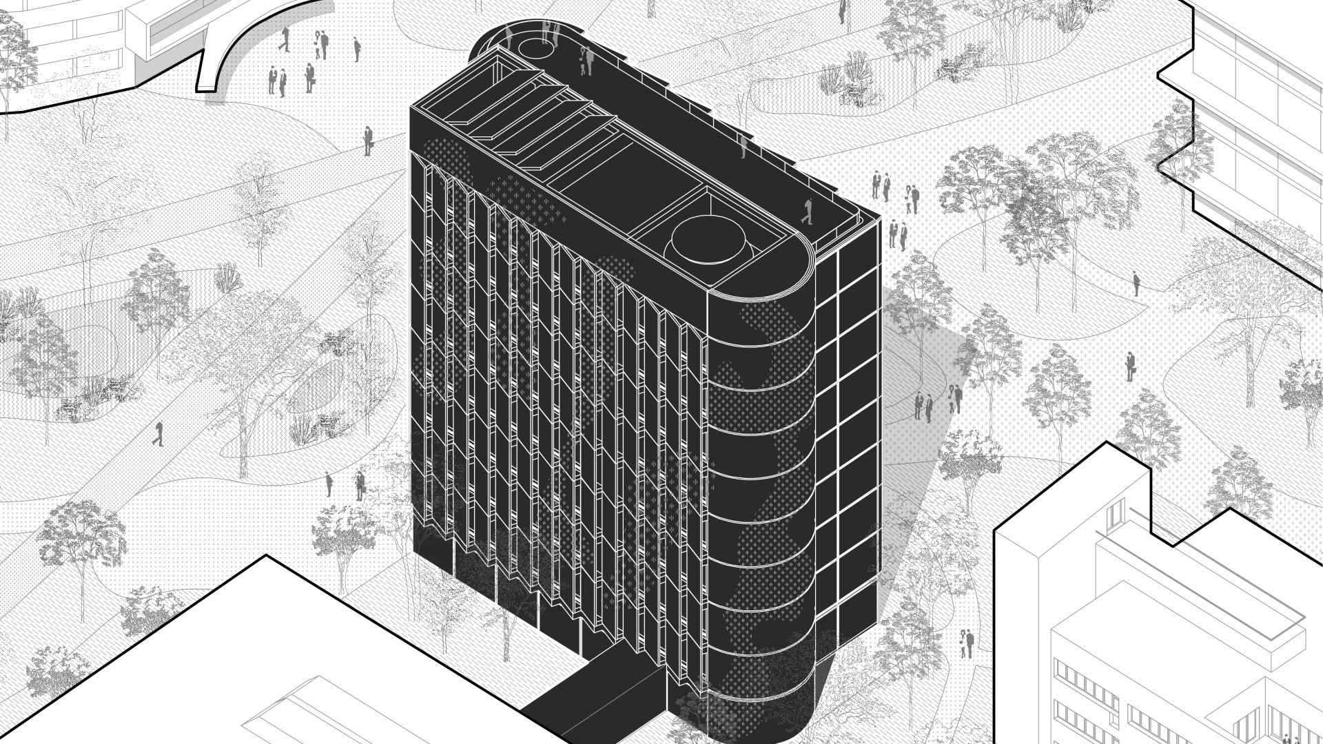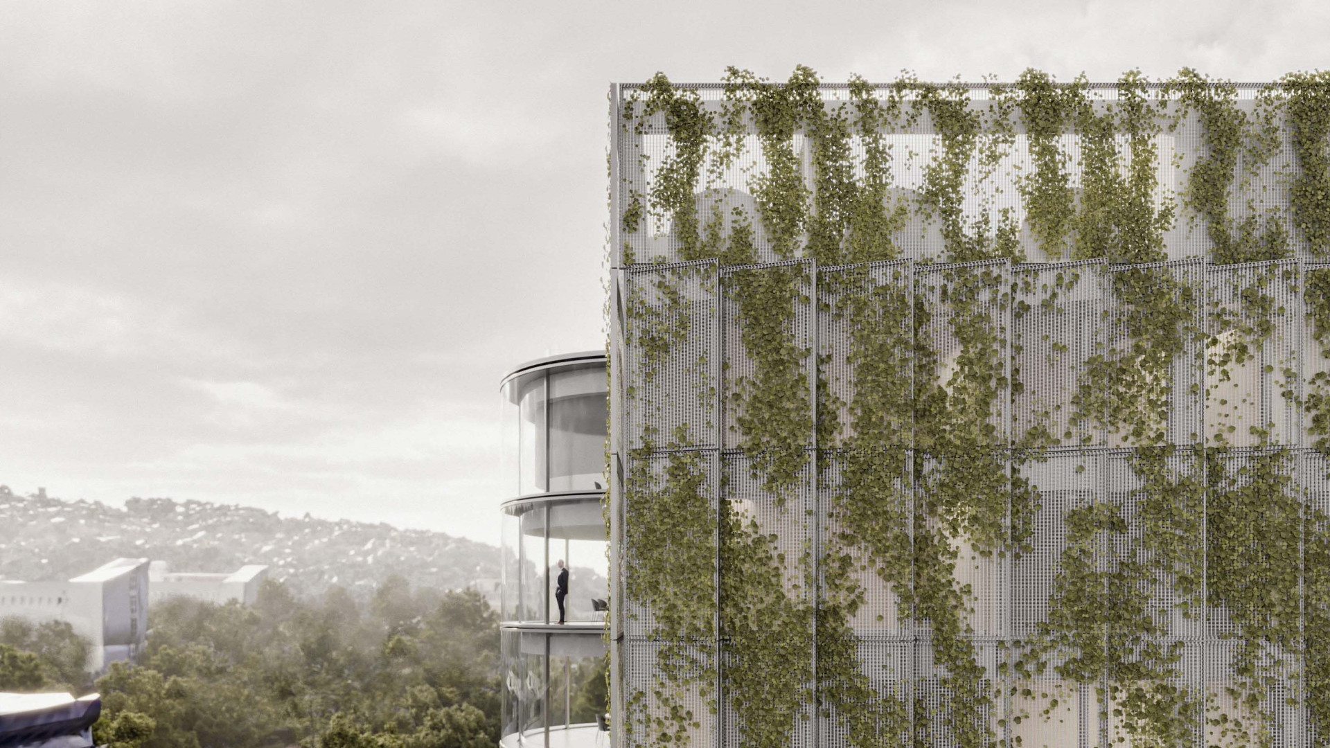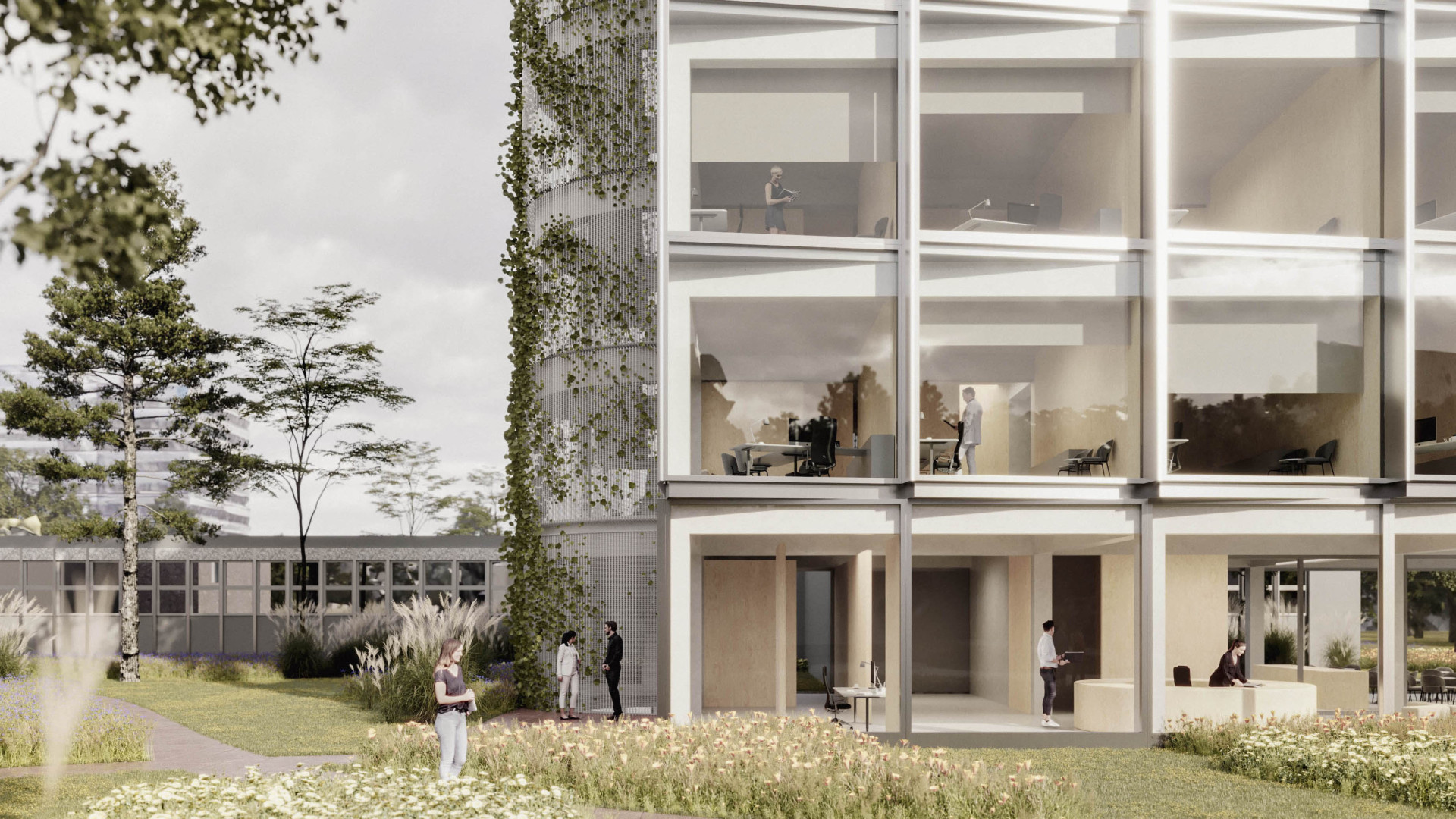 BratislavaThe design concept of the SAV Headquarters building is based on the mutual interaction between internal and external functions within a shared spatial framework. This concept is articulated through three principal themes: context, hierarchy, and interconnection. From an urban planning perspective, the SAV Headquarters completes the counterpart to the vertical mass of the Climate Cluster. The building closes the symmetrical composition in relation to the horizontal superblock to which it is connected. Within the central development area, the building is conceived as a vertical landmark. Its maximum height minimizes site coverage and, as a result, provides a greater amount of public open space. The architectural concept is derived from the fusion of two volumes into a single entity, reflecting the functional and structural division of the double-loaded layout. By shifting the two tracts by one module, a recognizable figure is created within the site while simultaneously establishing an internal spatial hierarchy. On one side, this is expressed through the green staircase core; on the other, through a vertical sequence of interior and exterior meeting rooms articulated toward the central public space of the campus. The vertical offset of the masses is achieved by placing the building technology on the roof of the service tract, discreetly screened by an architectural enclosure. The structural system consists of a reinforced concrete frame with a 7 × 7 metre module, alternatively 3.5 × 7 metres. The staircase core forms a self-supporting structural system. Elevator shafts and service facilities are positioned in the centre of the floor plan. The double-tract structural principle minimizes load-bearing elements and, together with the raised floor system, enables flexible interior layouts. The main tract accommodates offices and corner meeting rooms oriented toward the central public space, while the secondary tract contains service spaces, circulation, and atypical office units. The introduction of irregular office geometries transforms the central corridor into an open and fluid spatial environment. The main entrance to the SAV Headquarters is located beneath the corner meeting rooms, where a covered café terrace is also situated. A secondary entrance adjacent to the staircase provides access to the registry office. The ground floor remains open and visually connected to the surrounding green public space. At ground-floor level, the building is linked to Building No. 24. The working title for the façade expression is “green and glass” — a contrast of soft and rigid, transparent and opaque, living and inert material and volumetric articulation. The lower north-western office tract is fully glazed. The higher south-eastern service tract is clad in perforated metal panels intended to be gradually overgrown with vegetation. This integrated greenery improves the microclimate around the building and serves as a bearer of the cluster’s identity.