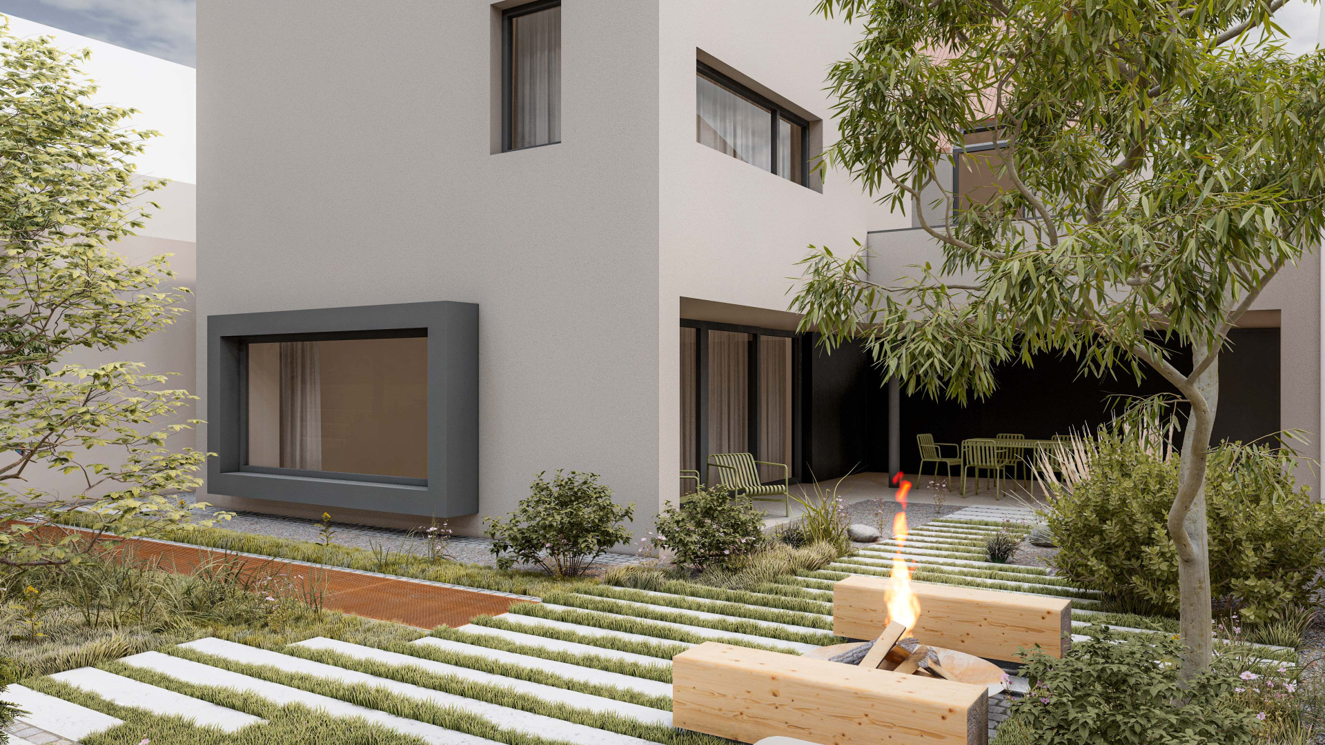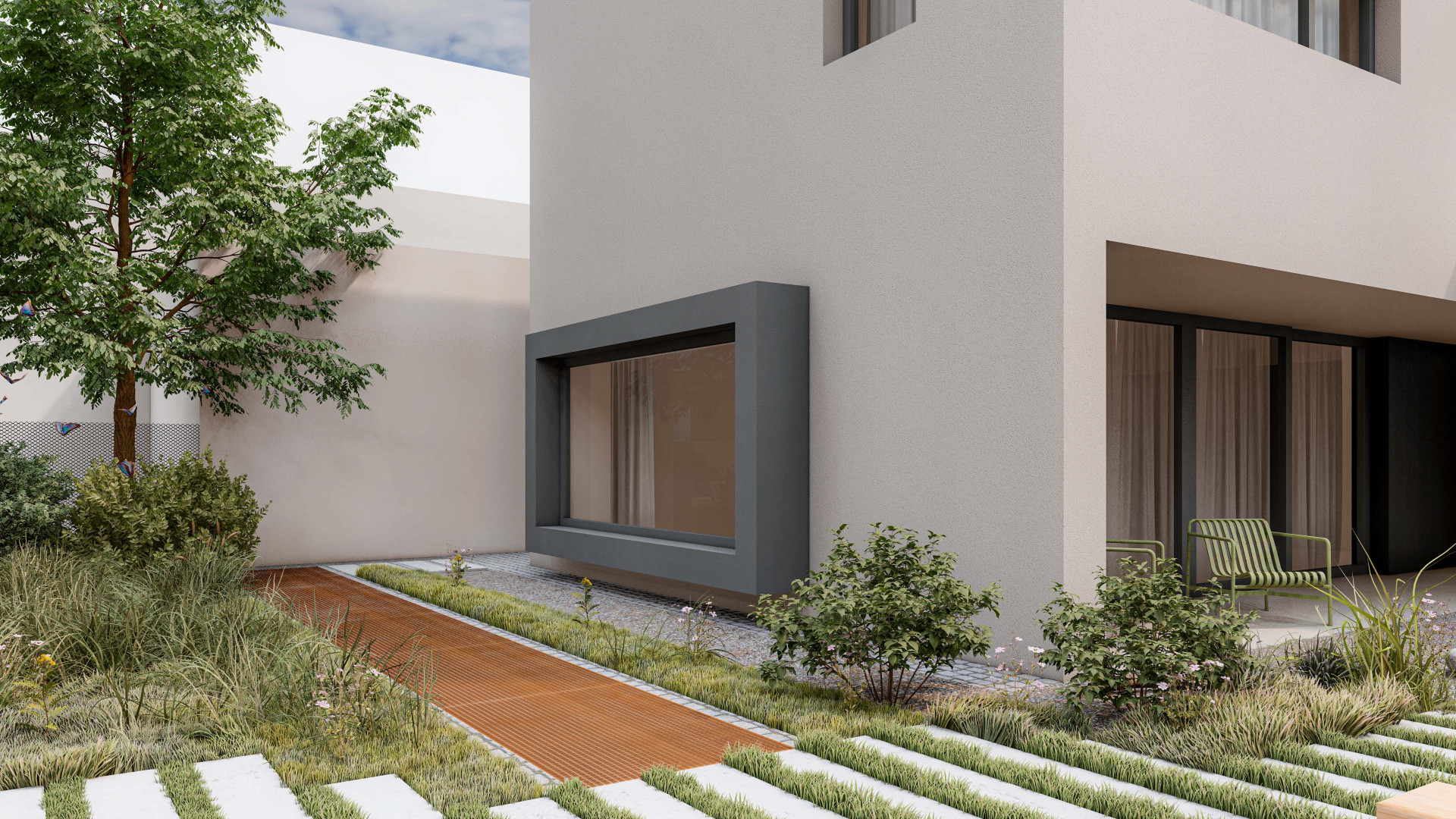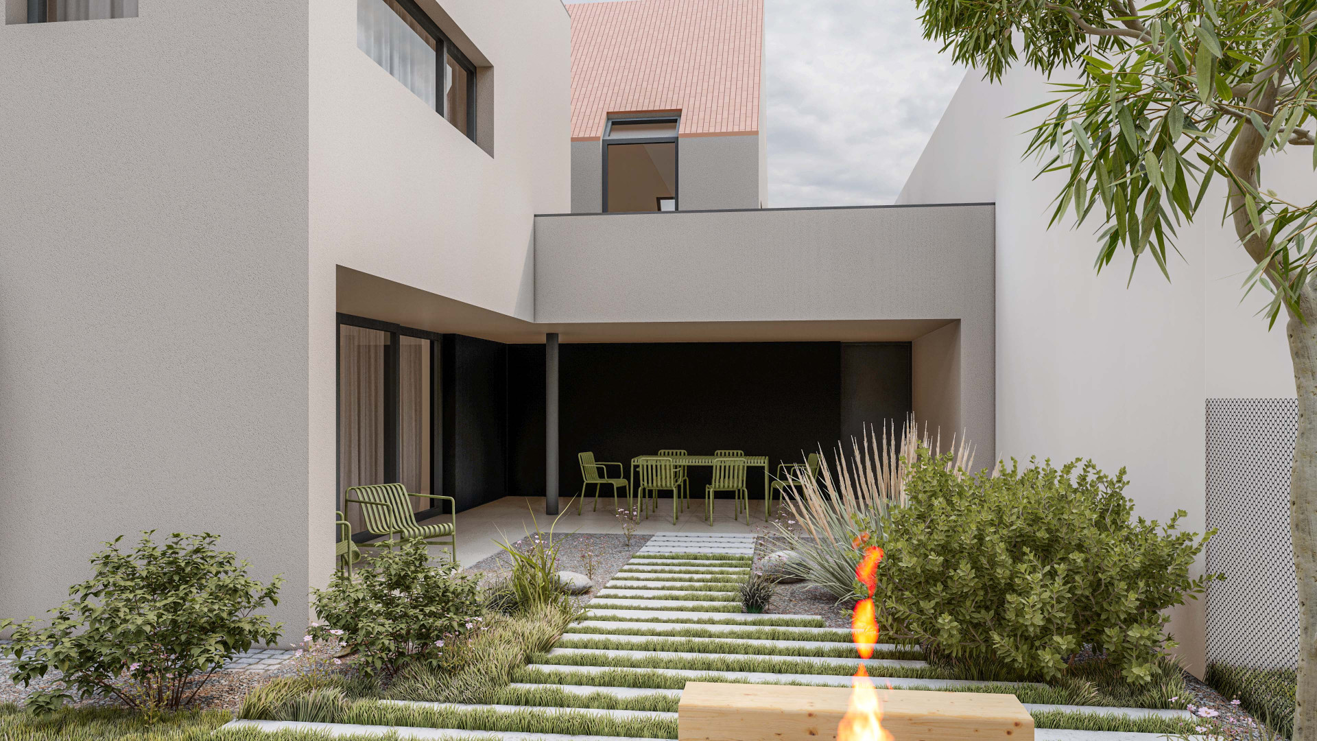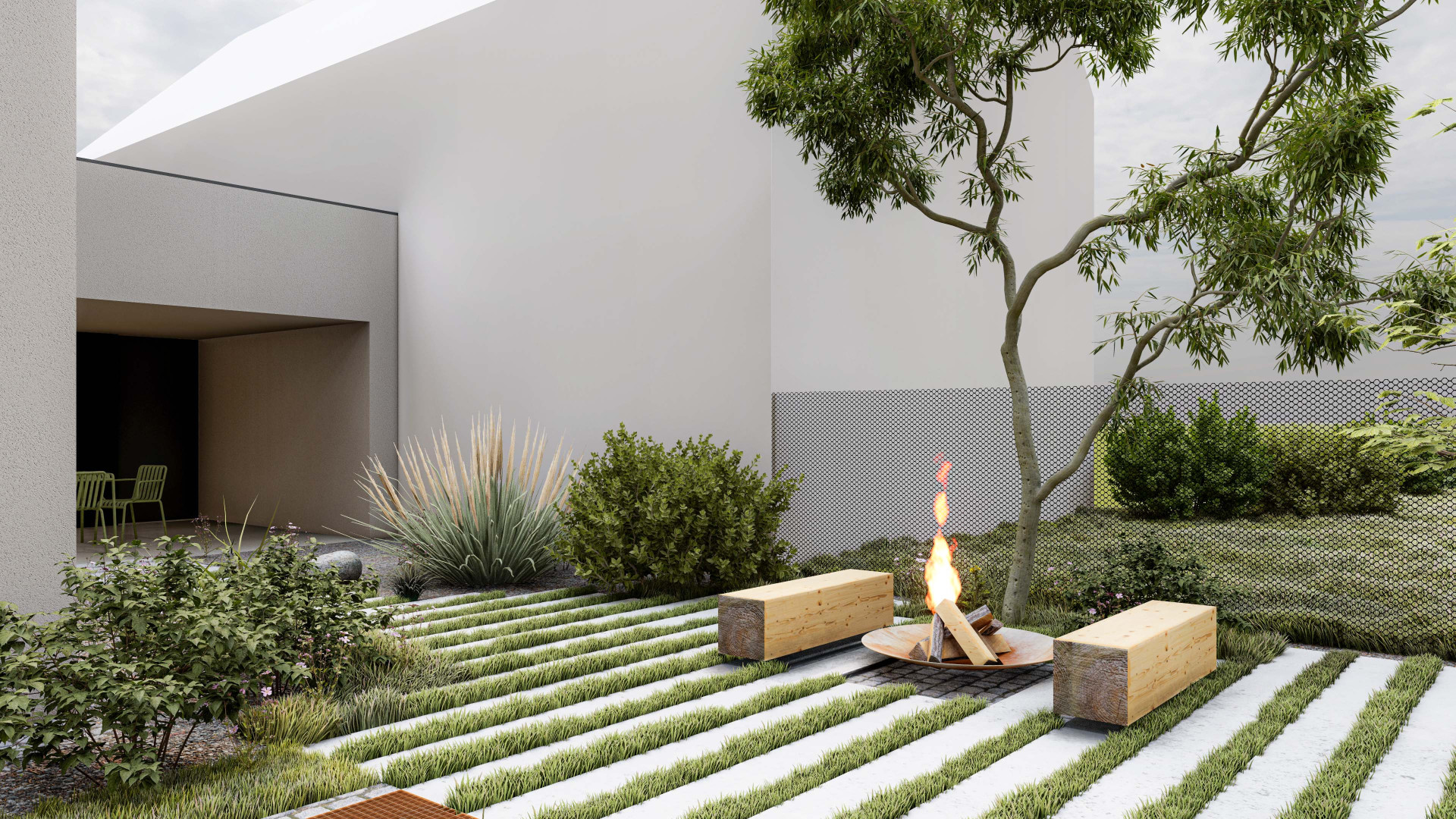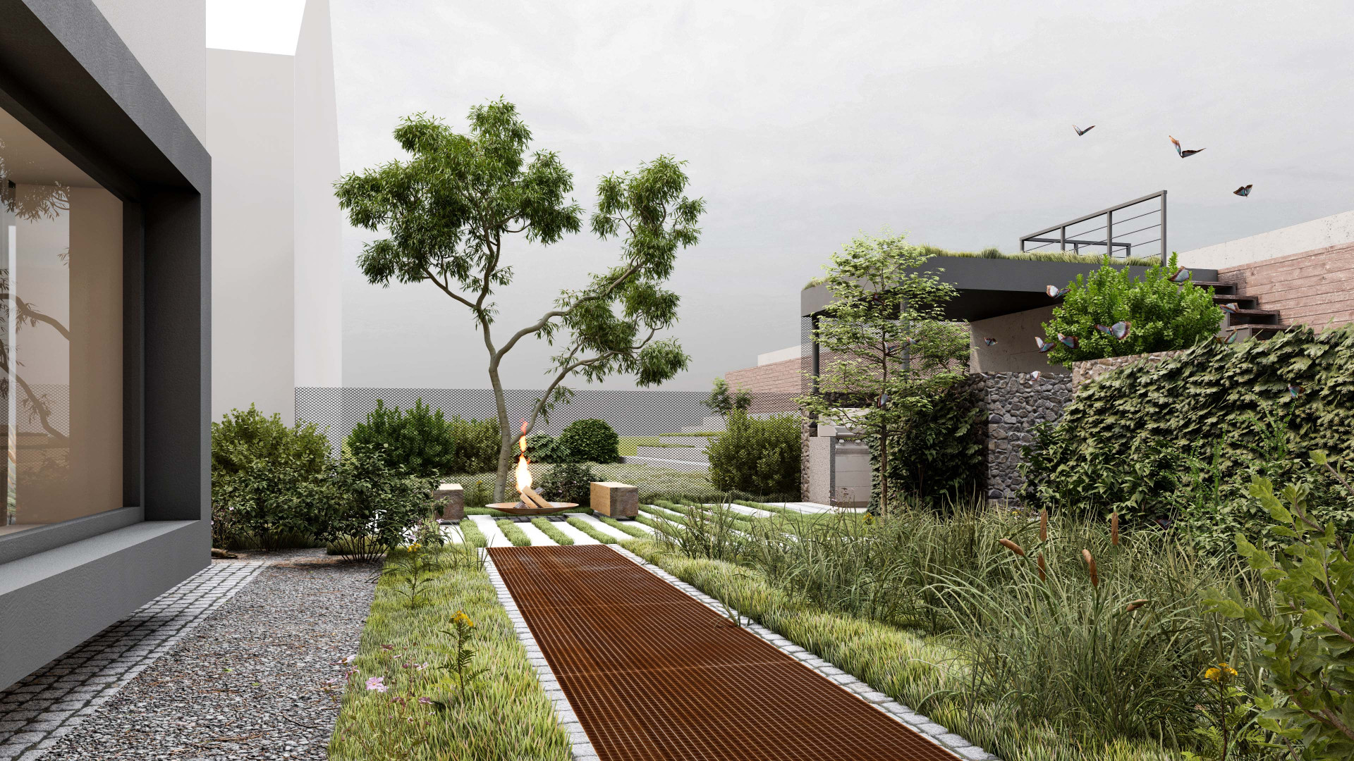 The material composition combines metal, Corten steel, and stone into a timeless, visually expressive compositional layer.